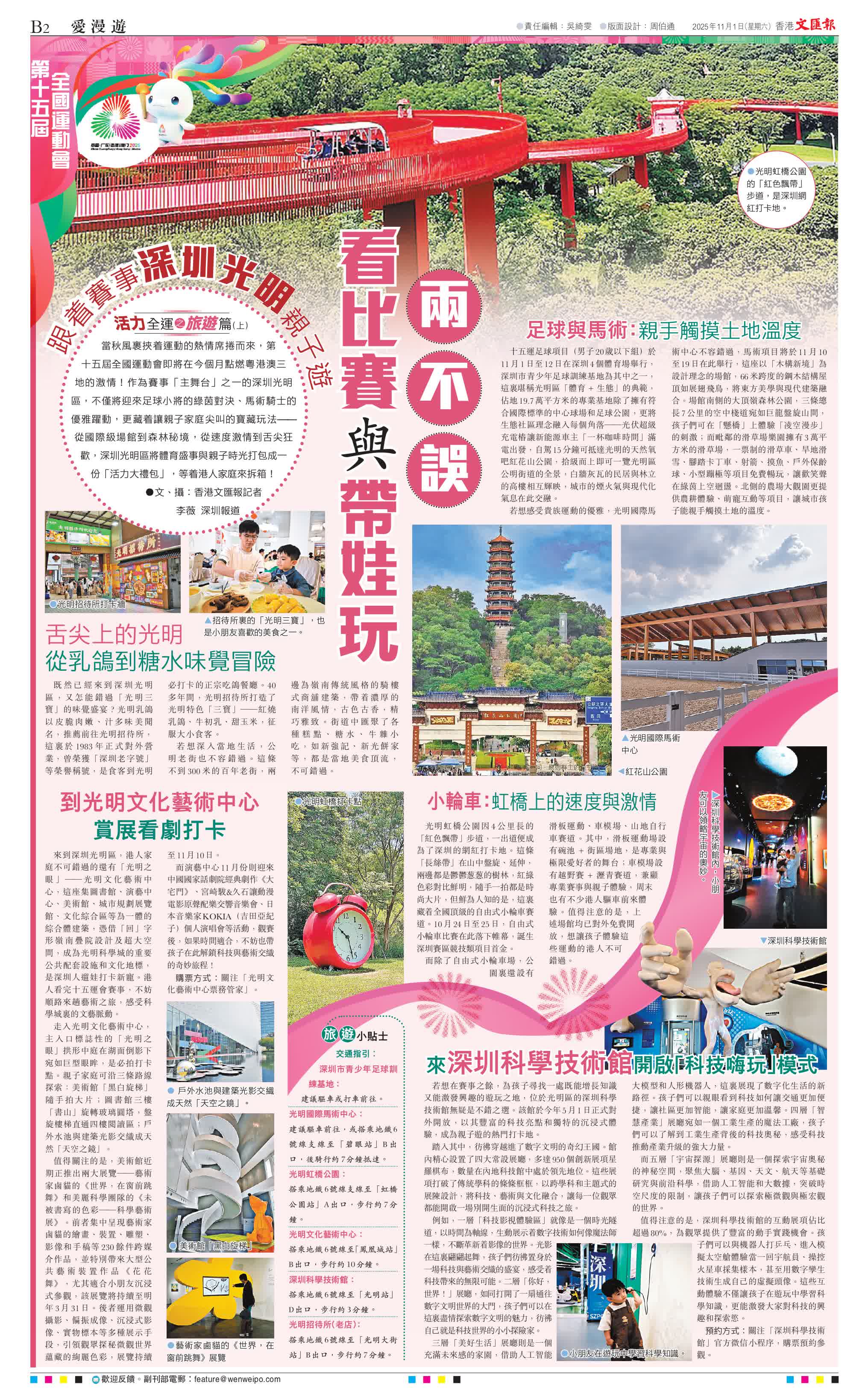 香港文匯報訊(記者李薇 深圳報道)當秋風裹挾着運動的熱情席捲而來,第十五屆全國運動會即將在今個月點燃粵港澳三地的激情!作為賽事「主舞台」之一的深圳光明區,不僅將迎來足球小將的綠茵對決、馬術騎士的優雅躍動,更藏着讓親子家庭尖叫的寶藏玩法——從國際級場館到森林秘境,從速度激情到舌尖狂歡,深圳光明區將體育盛事與親子時光打包成一份「活力大禮包」,等着港人家庭來拆箱!