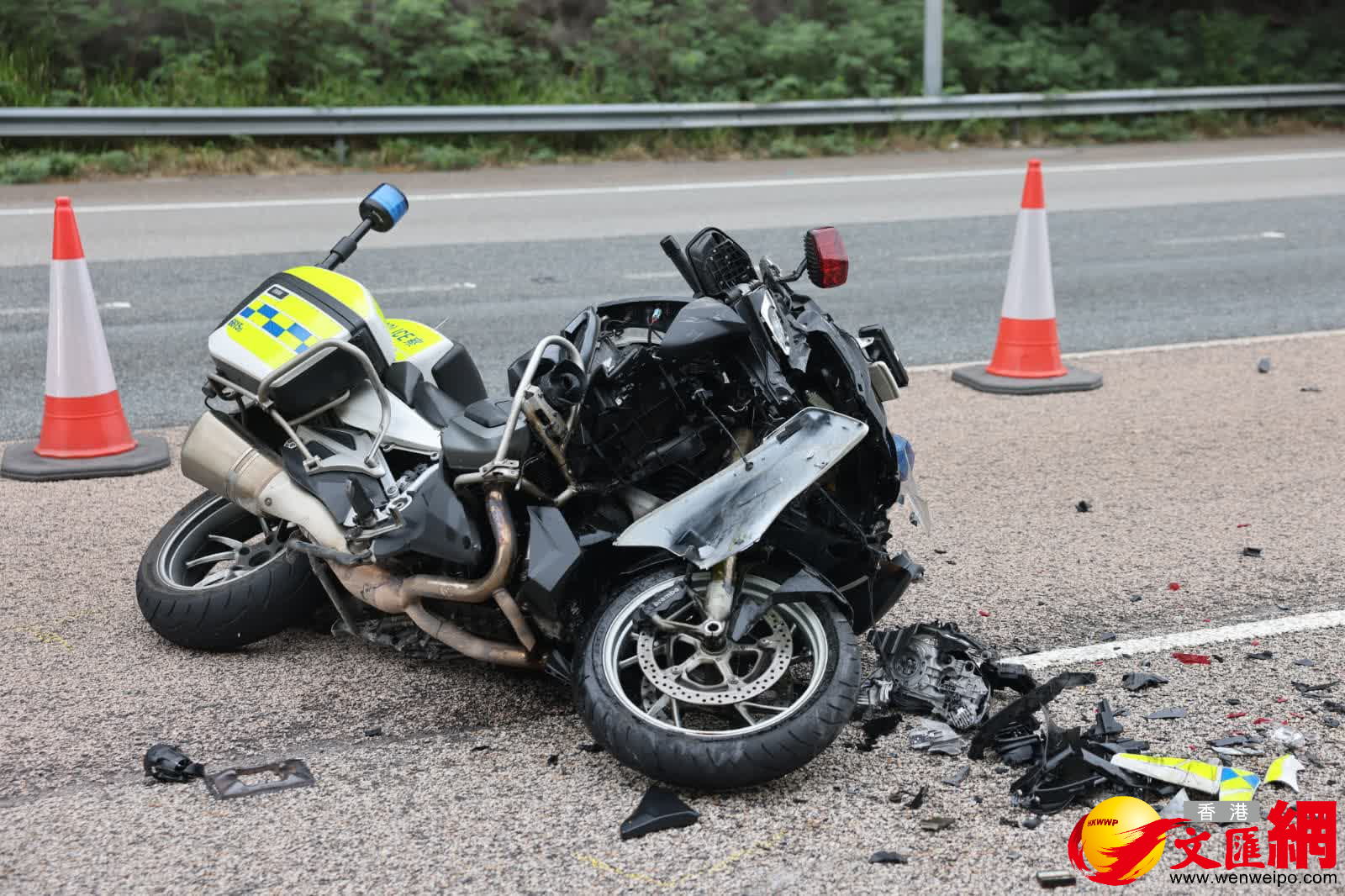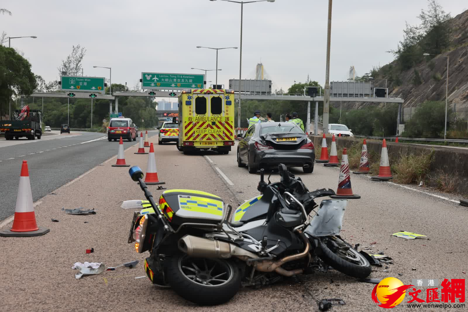 當時,警察電單車途經現場收掣不及,撞到私家車左邊車尾後翻側,警長被拋落地受傷,私家車司機見狀報警,救護員到場將傷者送院救治。據了解,警長左手手臂及椎骨骨折,送院時神志清醒。私家車女乘客和司機報稱不適送仁濟醫院醫治。案件由新界南交通部特別調查第二隊接手調查.