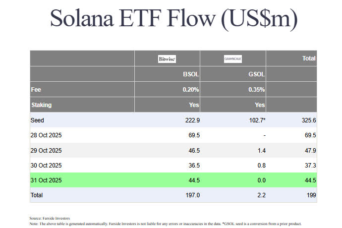香港文匯報訊(記者 黃安琪) 據Farside Investors數據,美國SOL現貨ETF淨流入4,450萬美元,其中Bitwise的BSOL淨流入4,450萬美元,灰度的GSOL淨流入為0。上市四日以來,Bitwise的BSOL總淨流入1.97億美元,灰階的GSOL 總淨流入為220萬美元,美國SOL現貨ETF總淨流入為1.99億美元。