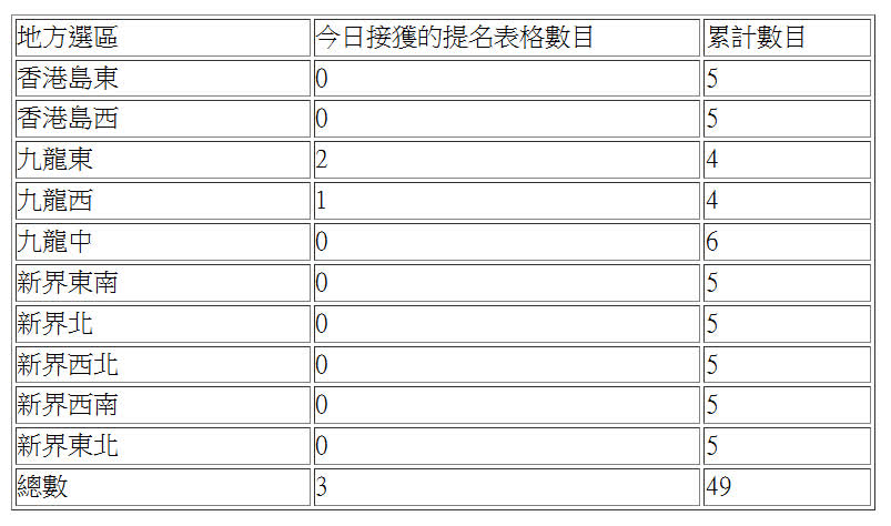 各地方選區接獲的提名表格數目如下: