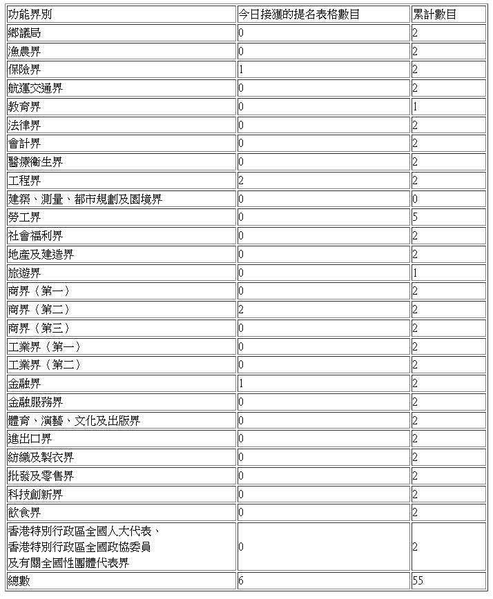 選舉委員會界別今日接獲的提名表格數目為5份,至今累計數目為44份。