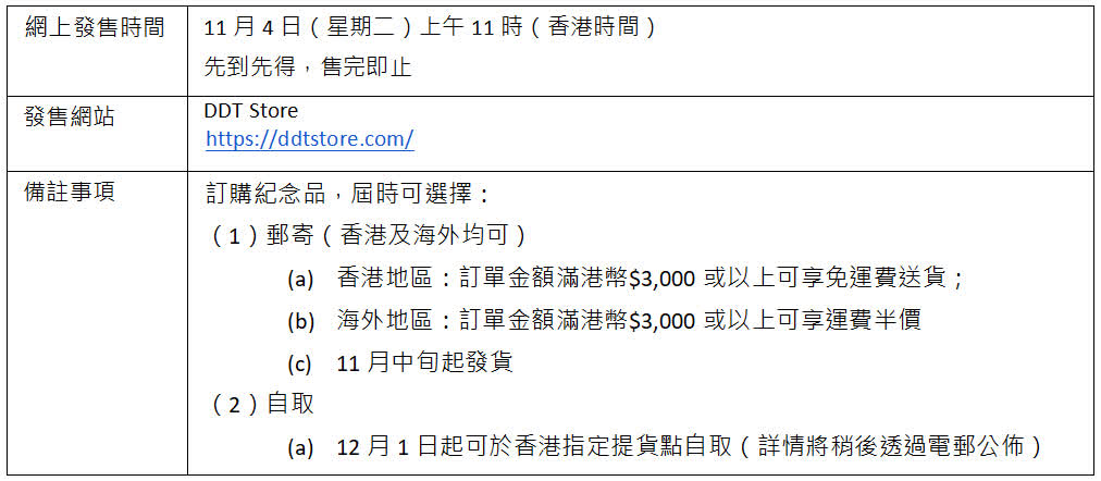 鑒於「巡遊市集」紀念品反應熱烈,主辦單位特別於活動結束後,安排部分市集限定紀念品在DDT Store官方網站(https://ddtstore.com/)限量上架,以滿足世界各地粉絲的期待。不同角色主題紀念品將於11月4日上午11時起在指定地區網上開售,讓更多粉絲能收藏心愛角色的限定紀念品。紀念品包括多啦A夢、KAWS & 芝麻街、Snoopy、TOLO元祖橡皮鴨及Netflix等,先到先得,售完即止。詳情請留意DDT Store網站或社交平台公布。