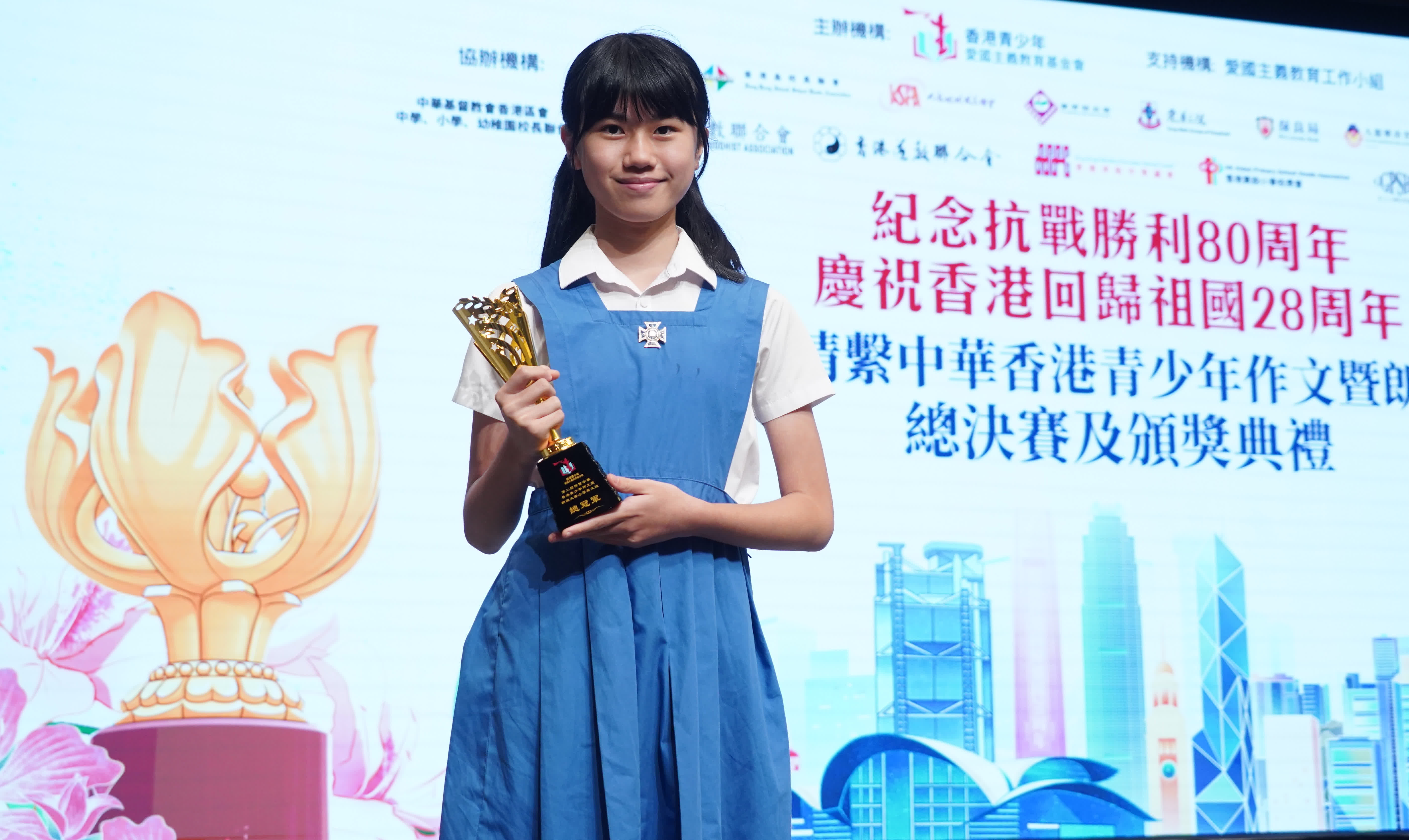 聖保祿學校(中學部)的蔡宛諺獲中學英文組總冠軍。她說,這次以英文詮釋愛國主題是一項全新挑戰,透過重溫香港回歸的歷史影像和搜集相關資料,深刻體會到祖國與香港之間的緊密聯繫。