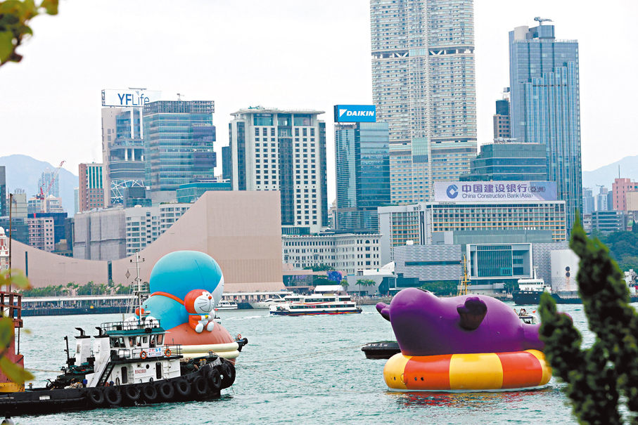 由創意品牌 AllRightsReserved(ARR)策劃及主辦的全球首創大型海上公共藝術展覽「維港海上大巡遊」昨日迎來重頭戲:多啦A夢、LABUBU、KAWS & 芝麻街(ELMO)及滑嘟嘟的四大IP巨型海上充氣雕塑組成「夢幻艦隊」,於昨日下午2時正式啟航,依次駛離金鐘添馬公園對開海域,在維港兩岸巡遊兩圈,歷時逾三個小時,吸引大批市民及旅客在兩岸觀看,有內地旅客更特意來港觀看巡遊。巡遊結束後「夢幻艦隊」傍晚6時以無人機表演與市民告別。 ●香港文匯報記者 李芷珊
