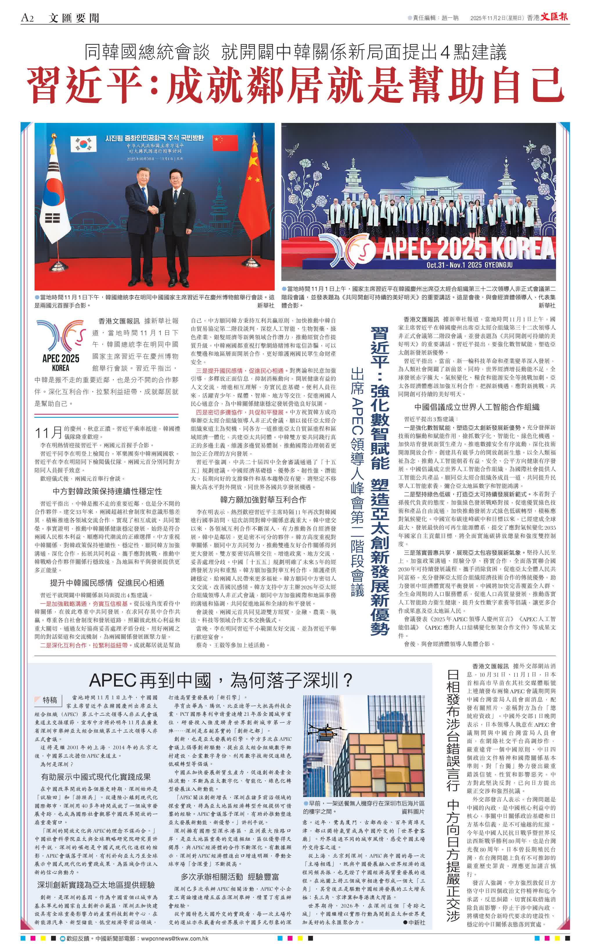 當地時間11月1日上午,中國國家主席習近平在韓國慶州出席亞太經合組織(APEC)第三十二次領導人非正式會議東道主交接環節,宣布中方將於明年11月在廣東省深圳市舉辦亞太經合組織第三十三次領導人非正式會議。