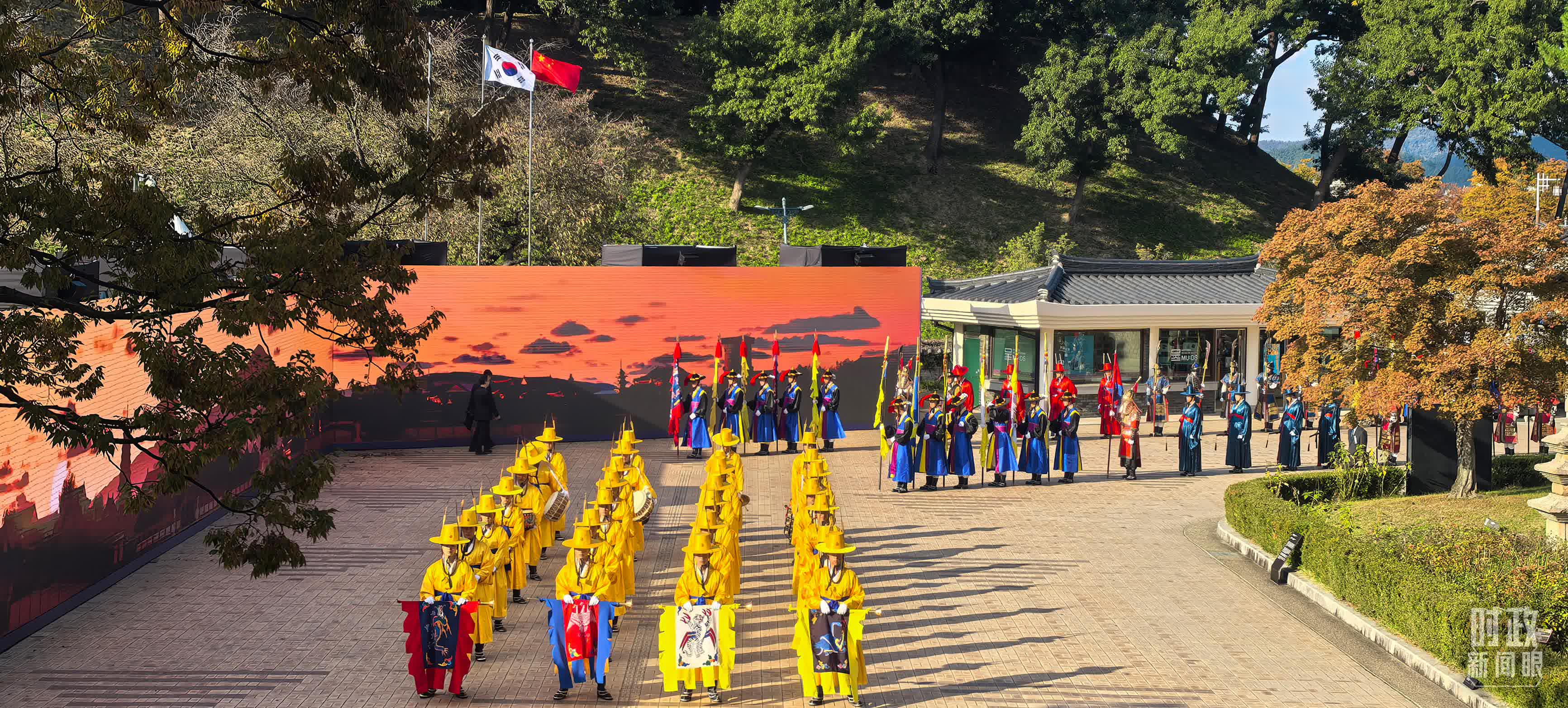 在慶州博物館的千年微笑館,李在明總統為習主席舉行高規格歡迎儀式,身着傳統民族服飾的韓國禮儀隊,隆重歡迎習主席到來。