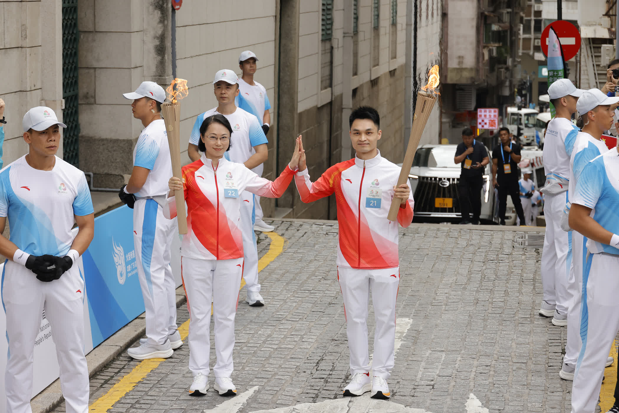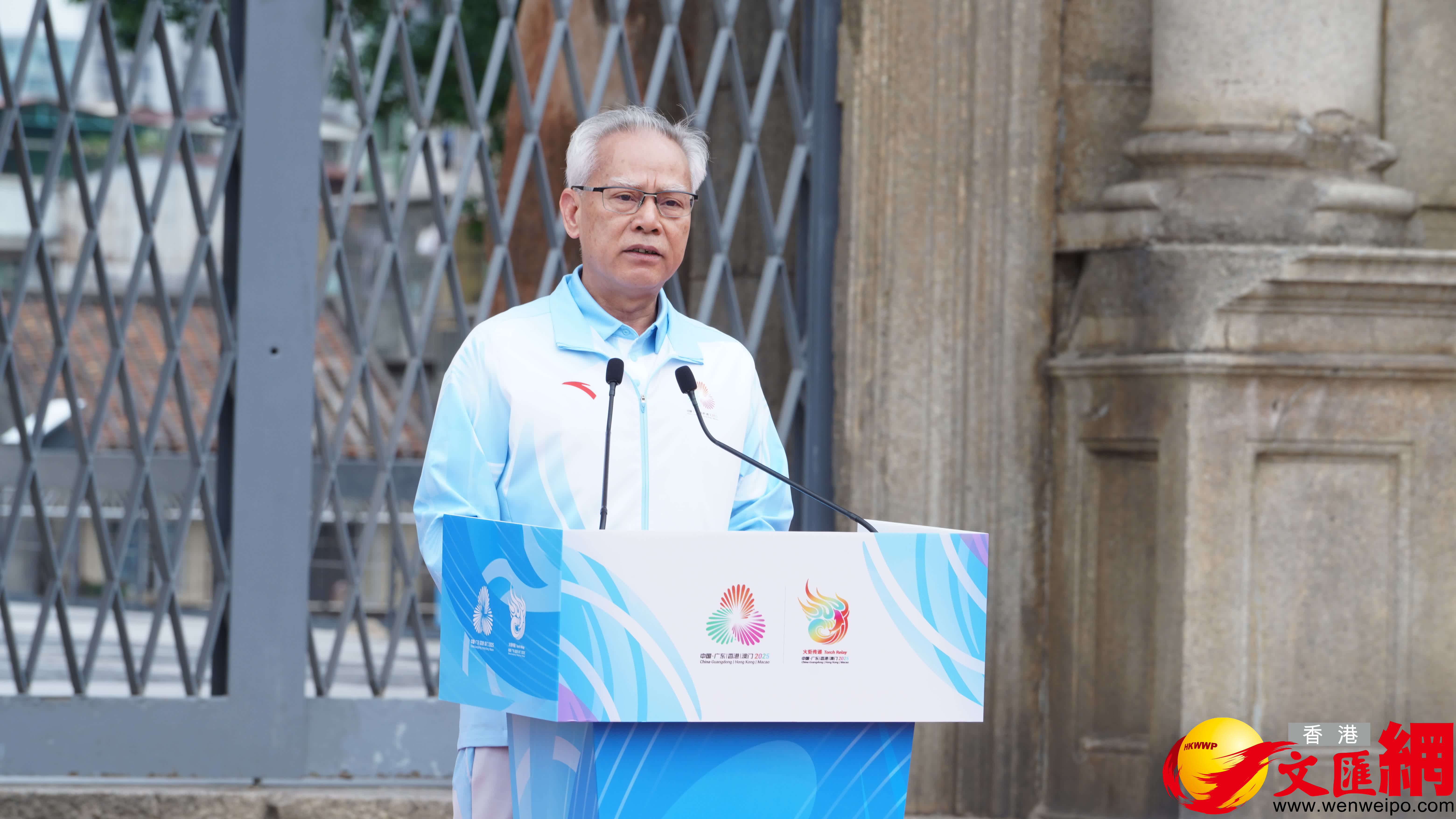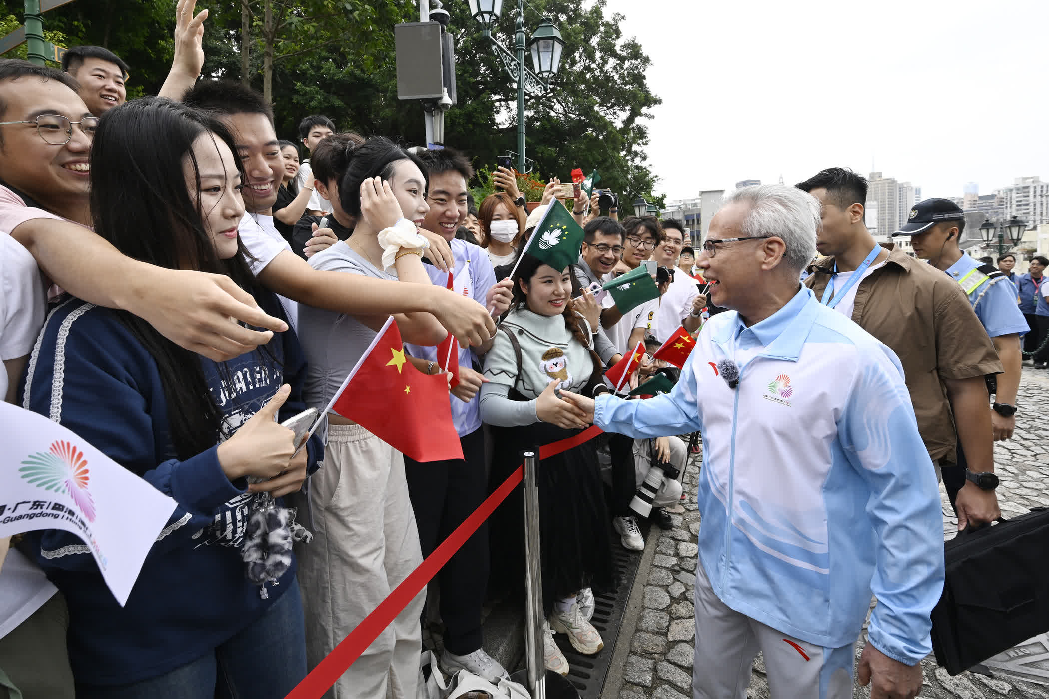 澳門特區行政長官岑浩輝致詞時表示,全運聖火象徵着光明與希望,火炬傳遞更是力量凝聚。50位火炬手接力相傳展現澳門奮發同行的城市風采,傳承着團結拚搏的體育精神。