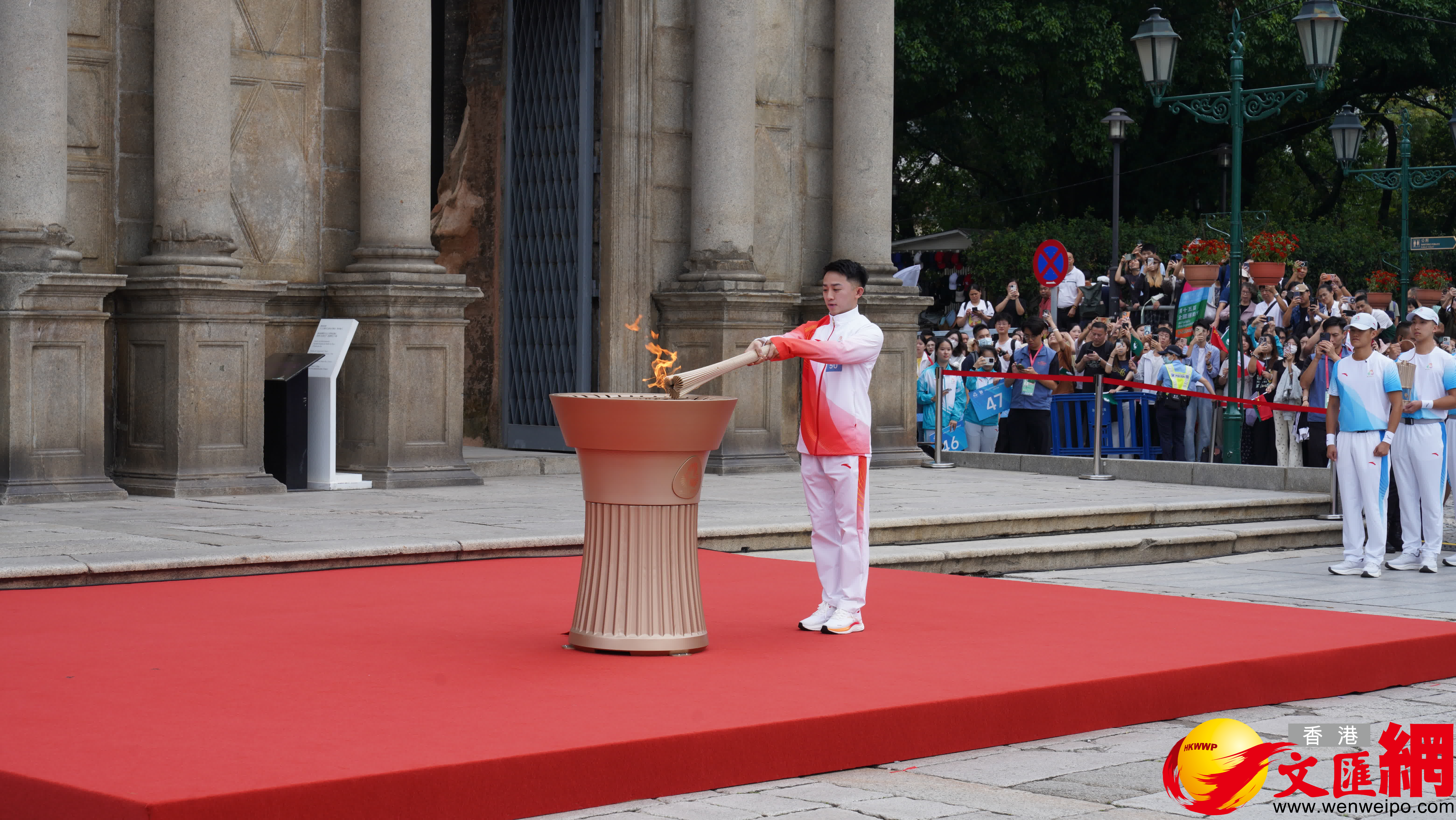 早上10時35分左右,最後一棒火炬手澳門空手道代表隊運動員郭建恒到達終點站大三巴牌坊後點燃火種盆。整個火炬傳遞過程歷時約一小時。