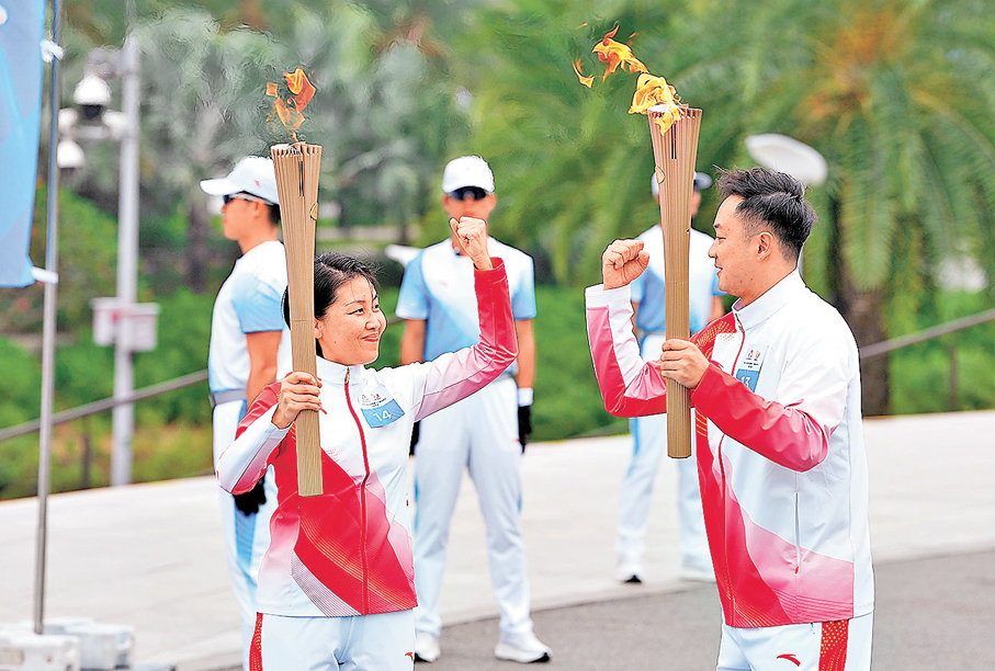 除了機器人,機器狗也現身火炬傳遞現場。記者看到,在火炬手將火種傳遞出去後,機器狗會用四隻腿走向火炬手,停在身邊,給他們送來十五屆全運會的吉祥物,為即將到來的十五運增添氛圍感。