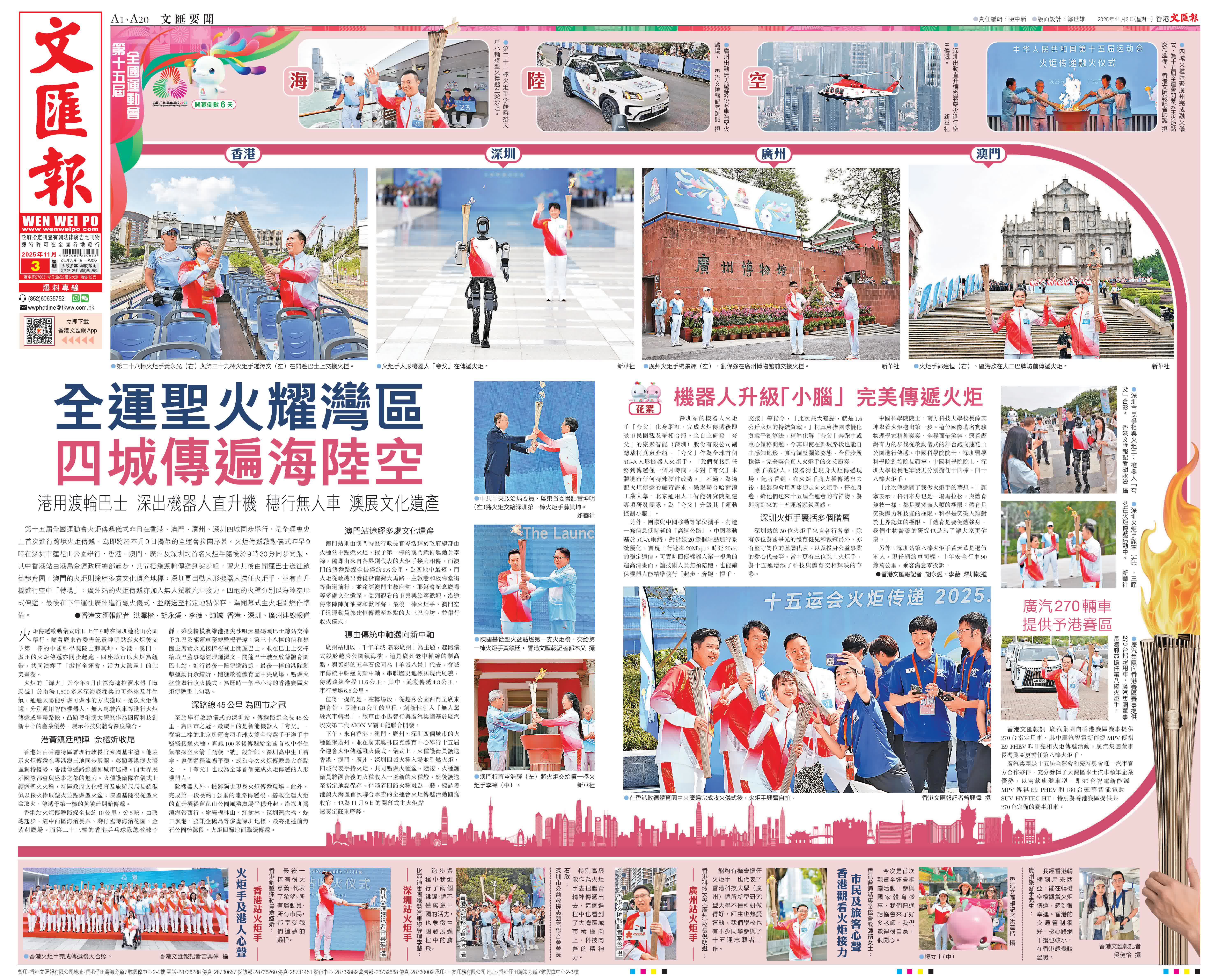 (香港文匯報記者 洪澤楷、胡永愛、李薇、帥誠 香港、深圳、廣州連線報道)第十五屆全國運動會火炬傳遞儀式昨日在香港、澳門、廣州、深圳四城同步舉行,是全運會史上首次進行跨境火炬傳遞,為即將於本月9日揭幕的全運會拉開序幕。火炬傳遞啟動儀式昨早9時在深圳市蓮花山公園舉行,香港、澳門、廣州及深圳的首名火炬手隨後於9時30分同步開跑,其中香港站由港島金鐘政府總部起步,其間搭乘渡輪傳遞到尖沙咀,聖火其後由開篷巴士送往啟德體育園;澳門的火炬則途經多處文化遺產地標;深圳更出動人形機器人擔任火炬手,並有直升機進行空中「轉場」;廣州站的火炬傳遞亦加入無人駕駛汽車接力。四地的火種分別以海陸空形式傳遞,最後在下午運往廣州進行融火儀式,並護送至指定地點保存,為開幕式主火炬點燃作準備。