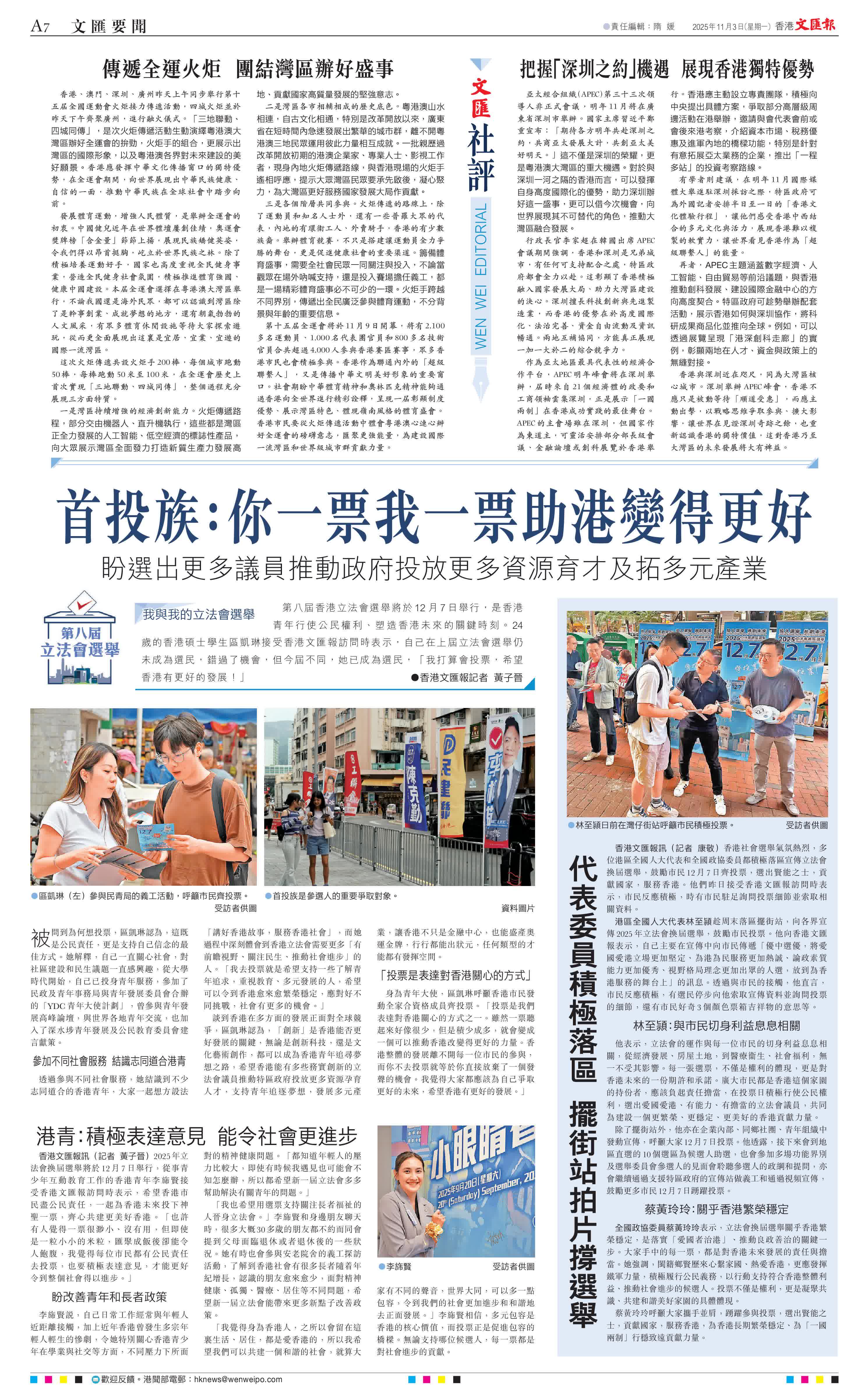 透過參與不同社會服務,她結識到不少志同道合的香港青年,大家一起想方設法「講好香港故事,服務香港社會」,而她過程中深刻體會到香港立法會需要更多「有前瞻視野、關注民生、推動社會進步」的人。「我去投票就是希望支持一些了解青年追求,重視教育、多元發展的人,希望可以令到香港愈來愈繁榮穩定,應對好不同挑戰,社會有更多的機會。」