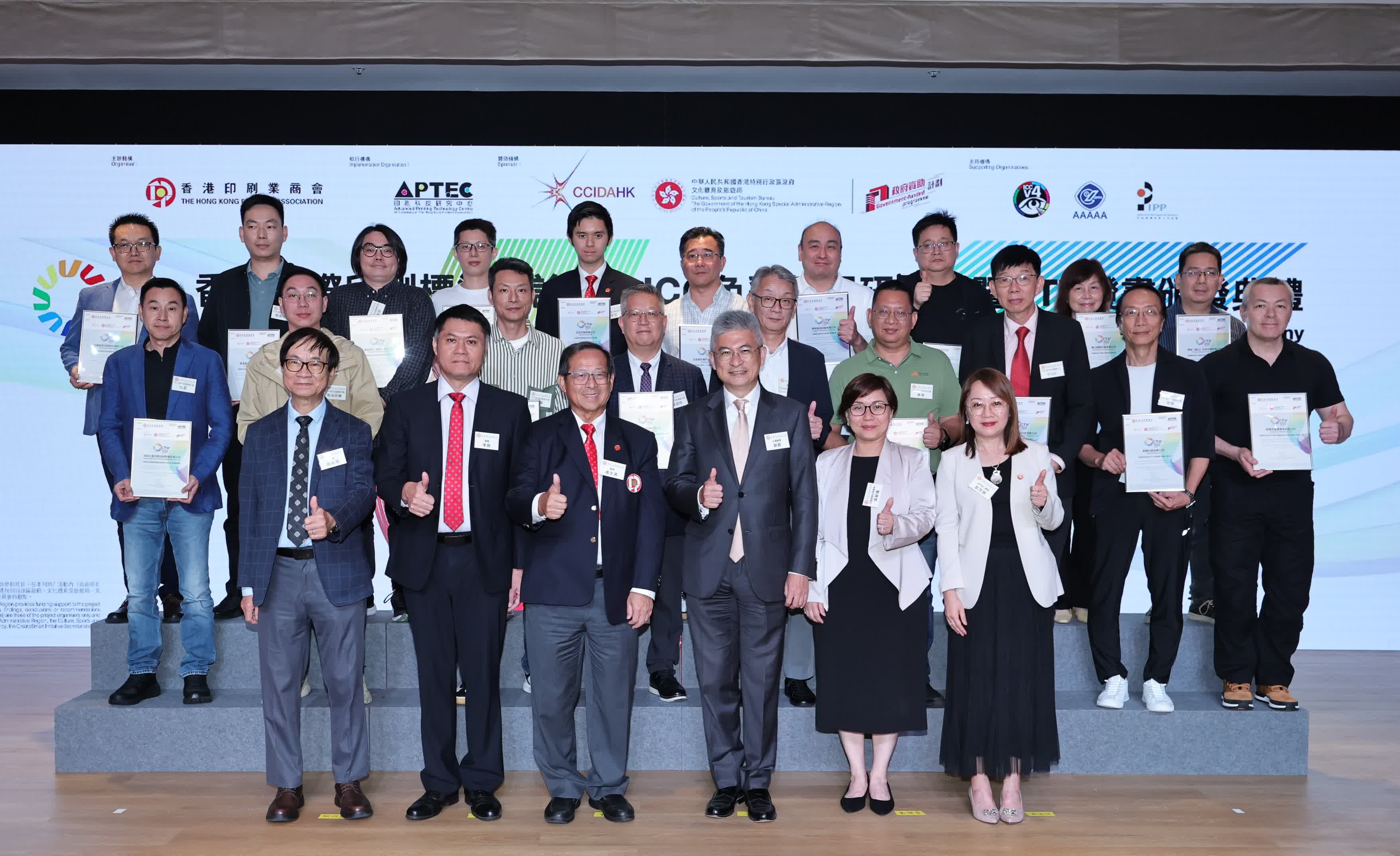 劉震和文創產業助理專員葉敏儀在「CTV證書頒發典禮」中向19間分別來自中國內地、香港、澳門及馬來西亞並在先導計劃下完成培訓的印刷企業,頒發「CTV認可印刷商」的證書。他們將會在全國及海外地區協助推廣CTV標準。