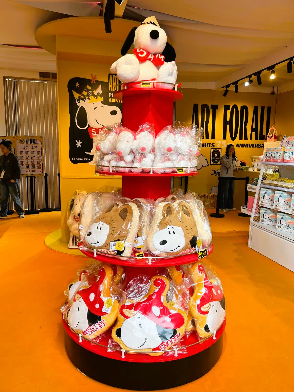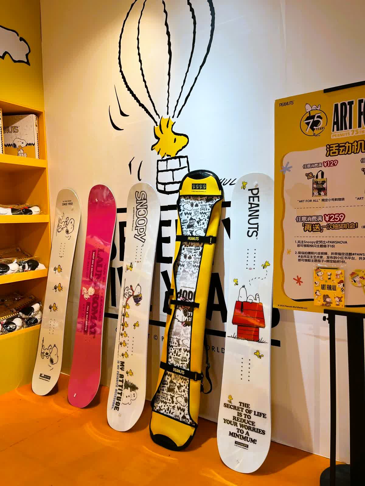 快閃店還有好運毛絨公仔吊飾盲盒(¥79),分別有史努比抱住健康、快樂、平安牌的毛公仔,值得入手。當然其他史努比印章、手辦等盲盒也極吸引,場內更有杯、碟、縮骨遮等實用好物,並有藝術家聯名抱枕(¥89),總有一款啱大家。此外,史努比的滑雪板超巨型,價格由¥2,580至¥3,280不等,吸引不少到場人士站在旁邊打卡。