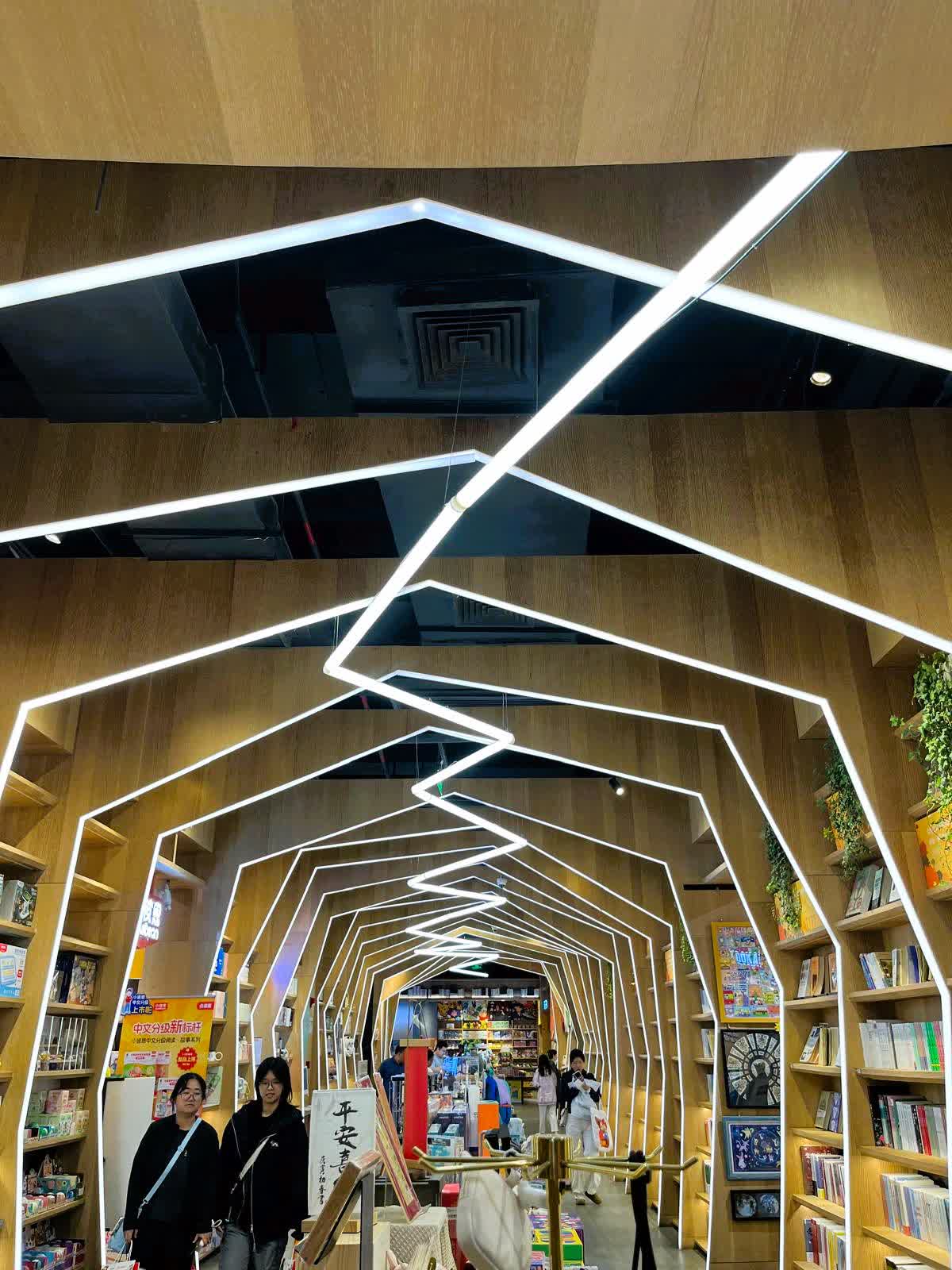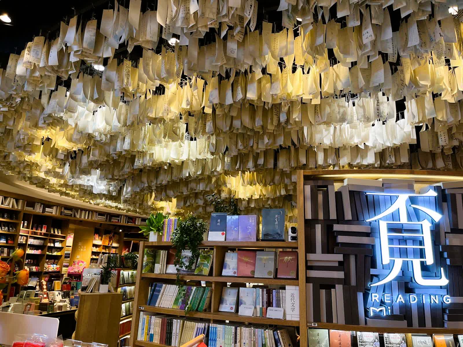 各位港客買完心頭好,可由壹方城L1走到L3的網紅書店「覔書店」。喧嘩的商場難得有一間安靜書店,特設咖啡廳提供極多座位,吸引不少當地的學生、家長及港客前來探店或看書。覔書店內逾1,000平方米空間,設圖書區、文創區、兒童區及動漫區等,照顧不同年齡及喜好客人需要。店家最具特色是一個接近20米的時空長廊,由近正門位置連接至不同區域,中間放滿書籍及不同文創物品,長廊上方的燈飾絢麗具氣派,設計風格亮麗,是網紅拍照打卡的熱點。此外,走過時空長廊後接近書店的中央位置,圓形區域上方掛了無數紙條,顧客可以在紙條上寫下寄語及感想再掛上,氛圍感滿滿。