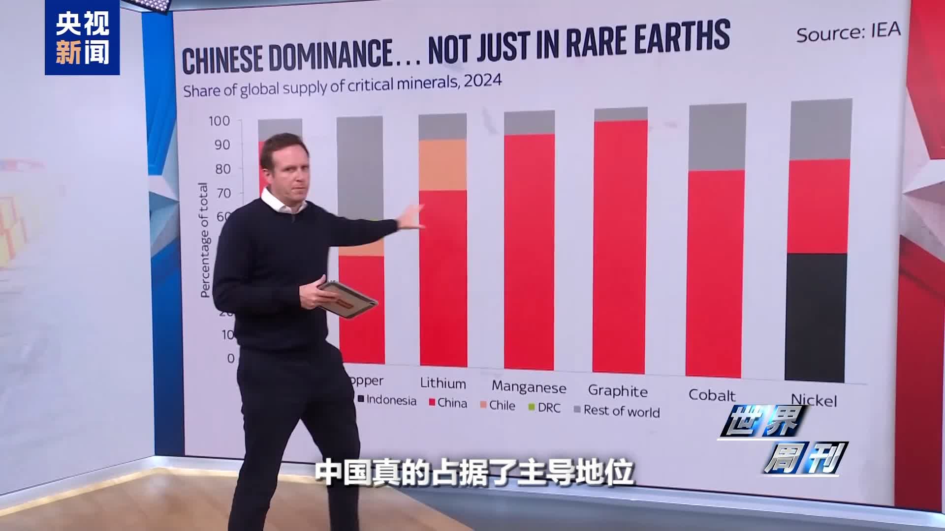 英國天空新聞主持人:看看銅、鋰、錳、石墨、鈷,中國真的佔據了主導地位。多年前中國就決定,在這些供應鏈佔據主導地位,不僅是供應鏈,還包括相關的產品。
