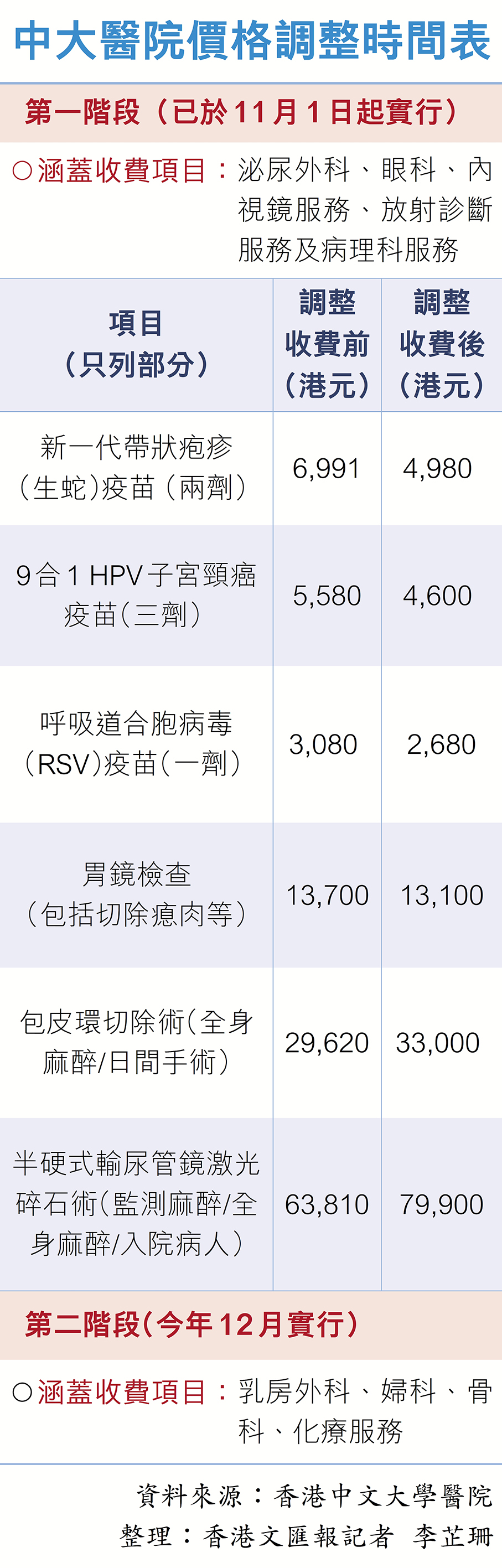 院方於第一階段共檢視1,358個收費項目,共有1,011項(74.4%)減價、324項(23.9%)凍結收費;另有十項中大醫院定價收費項目轉為醫生綜合定價收費項目以提升服務靈活性,但有13項經成本審視後適度加價,主要涉及泌尿外科及病理化驗服務,因手術會有併發症風險等。