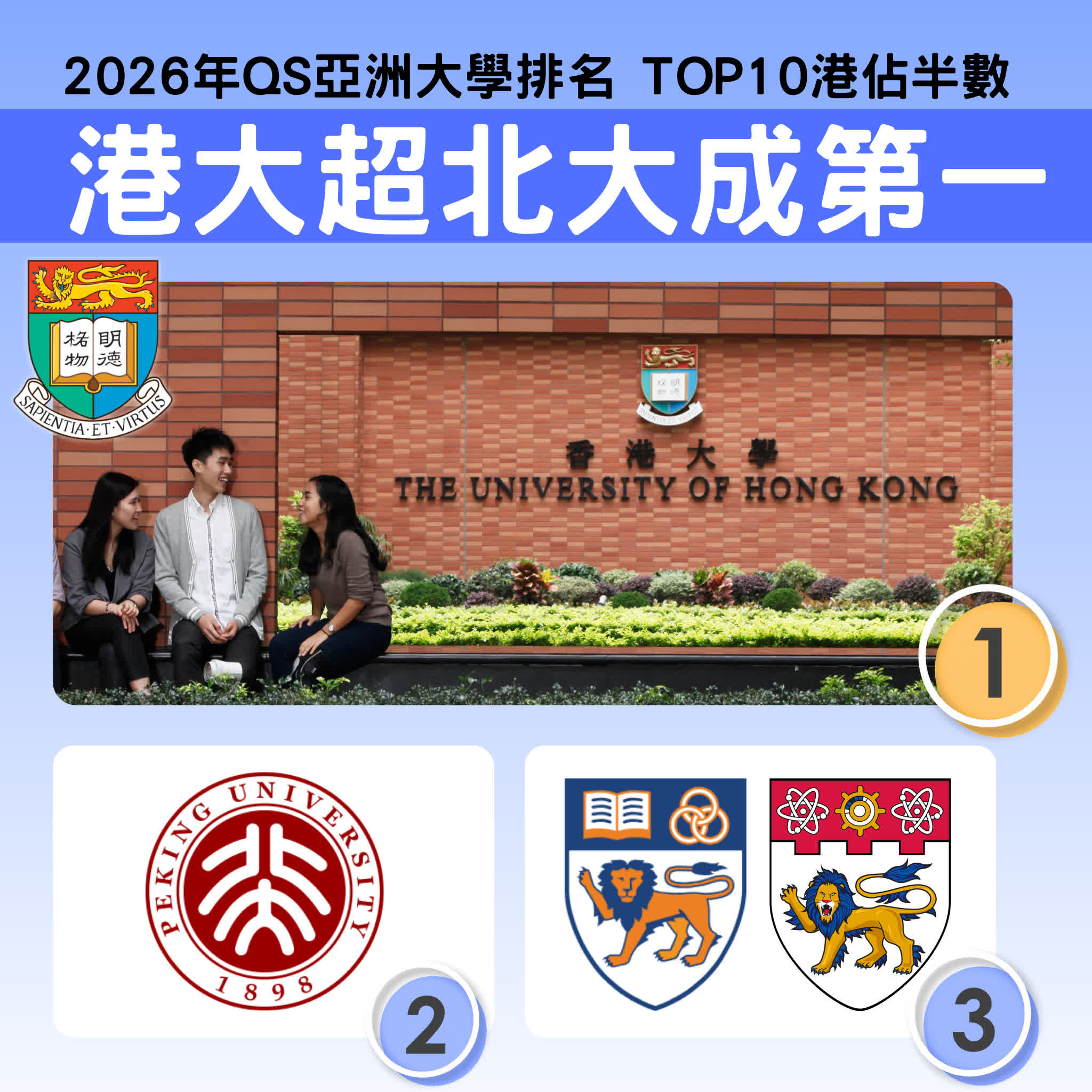 香港文匯報訊(記者 陸雅楠)特區政府積極以多元政策推動香港發展為國際專上教育樞紐與高端人才集聚高地,各大學在世界學術排名中屢創佳績,令「留學香港」品牌蜚聲國際。全球高等教育權威分析機構Quacquarelli Symonds(QS)今日(4日)公布2026年亞洲大學排行榜,香港大學時隔15年再度登頂亞洲第一,超越本屆降至第二位的北京大學,標誌本港高等教育實力於國際舞台再創高峰。令人矚目的是,今年香港共有11所大學上榜,有9所名次提升,4所創下歷史佳績,其中5所更躋身亞洲前十,整體進步率冠絕全亞洲,擁有前十大學數量超越所有其他地區。