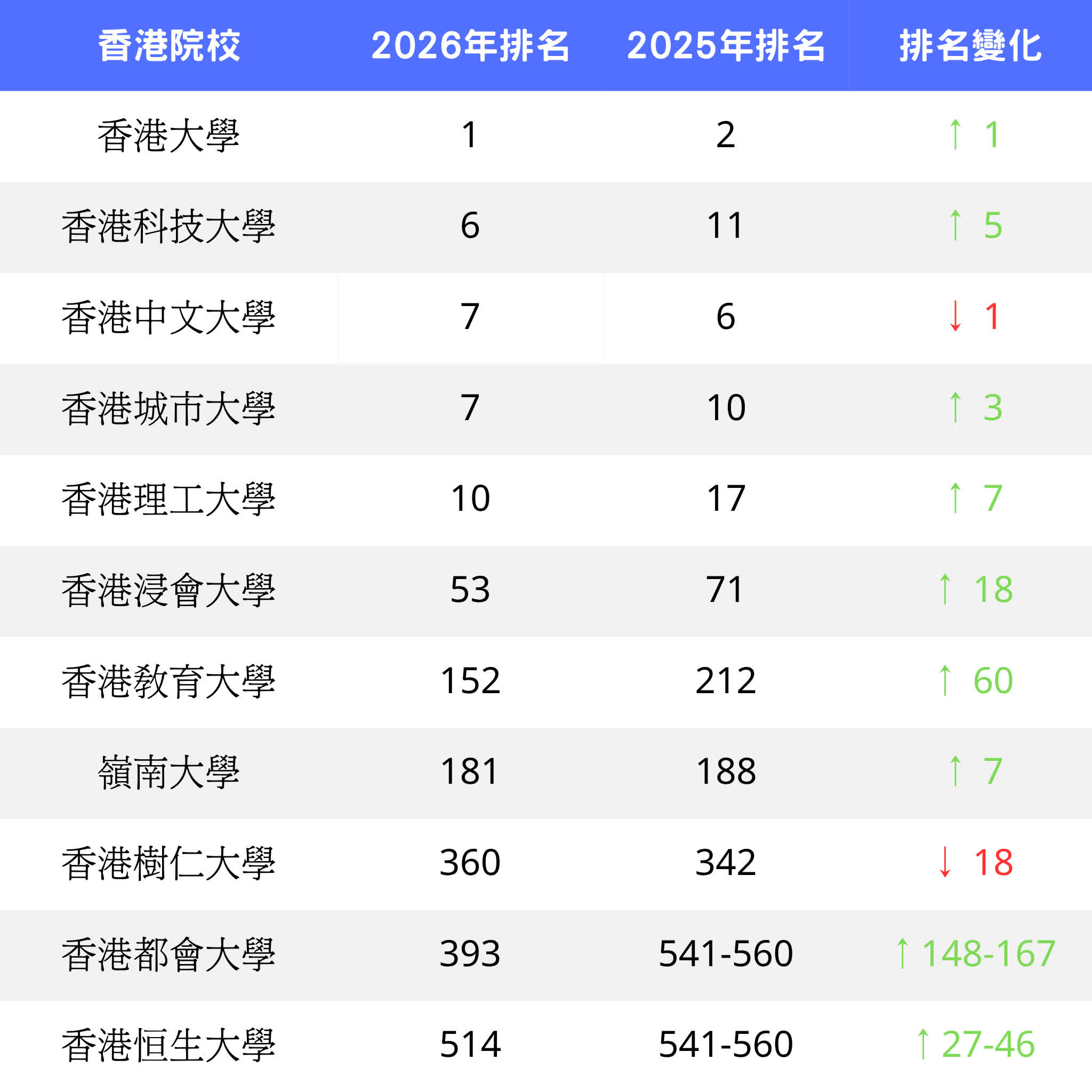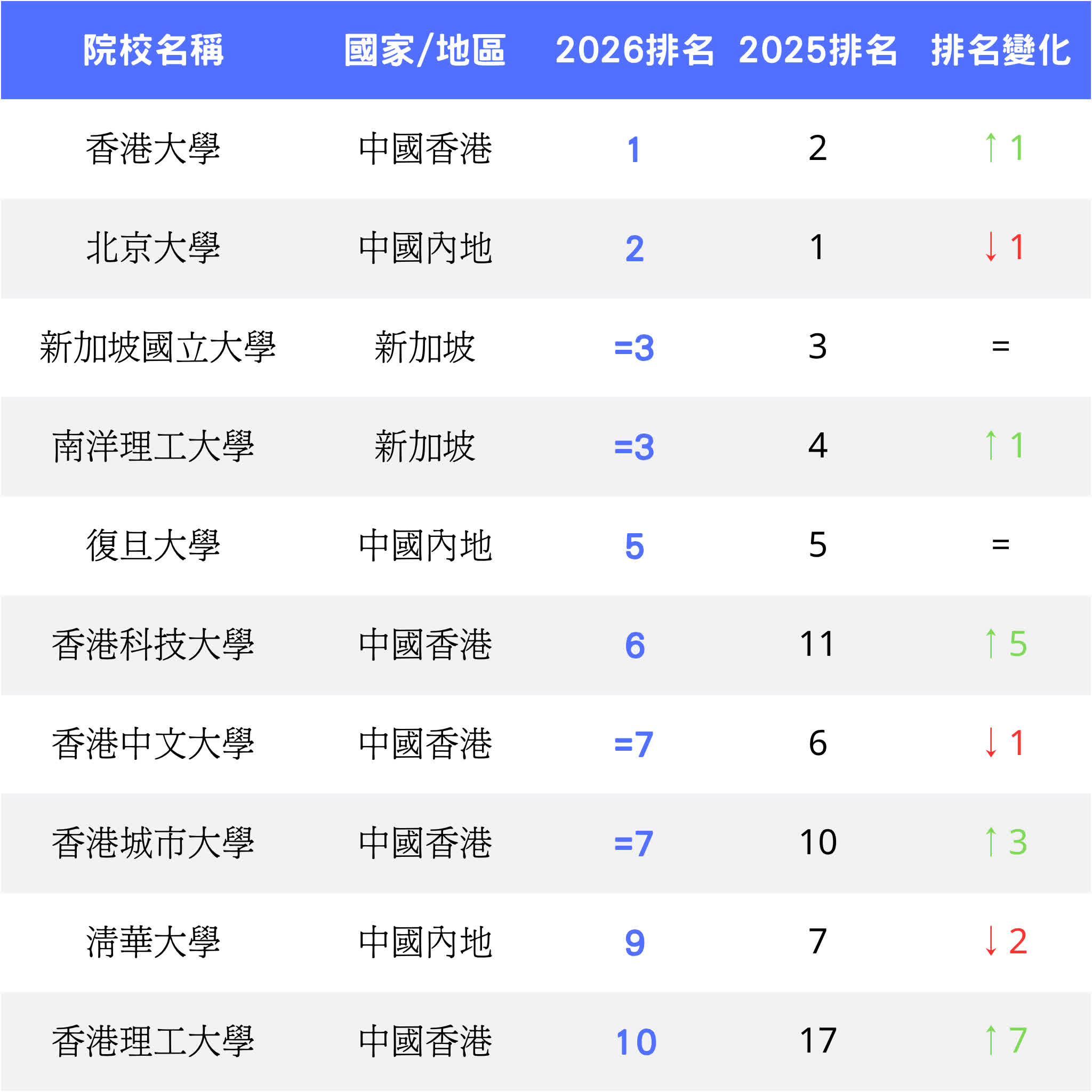 整體排名方面,港大今年榮登榜首,北京大學位居第二,南洋理工大學躍升一位,與新加坡國立大學並列第三。復旦大學保持第五位。香港科技大學與香港理工大學同樣晉身十強,科大由第十一位大幅攀升至第六位,理大則首度躋身亞洲前十,由第十七位躍升至第十位,僅次於第九的清華大學。此外,香港城市大學上升三位,香港中文大學微降一位,兩校並列亞洲第七。本港多所院校表現亦同樣出色,香港浸會大學、香港教育大學及嶺南大學三所資助大學排名均見提升,其中教大升幅尤為顯著,躍升六十位至第一百五十二位。