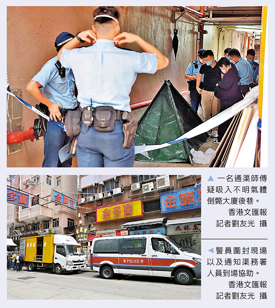 香港文匯報訊(記者 蕭景源)一名通渠公司男東主,昨在油麻地一大廈後巷疑獨自打開渠蓋工作時,意外吸入沼氣昏迷倒地,頭部伏在沙井內,直至40多分鐘後胞姐發現報警,惜已證實死亡。渠務署事後派員到場了解。死者的親友趕到現場時,死者妻子情緒激動,一度傷心痛哭,大喊:「老公、老公!畀返個老公我,救命呀!」要由親友攙扶。