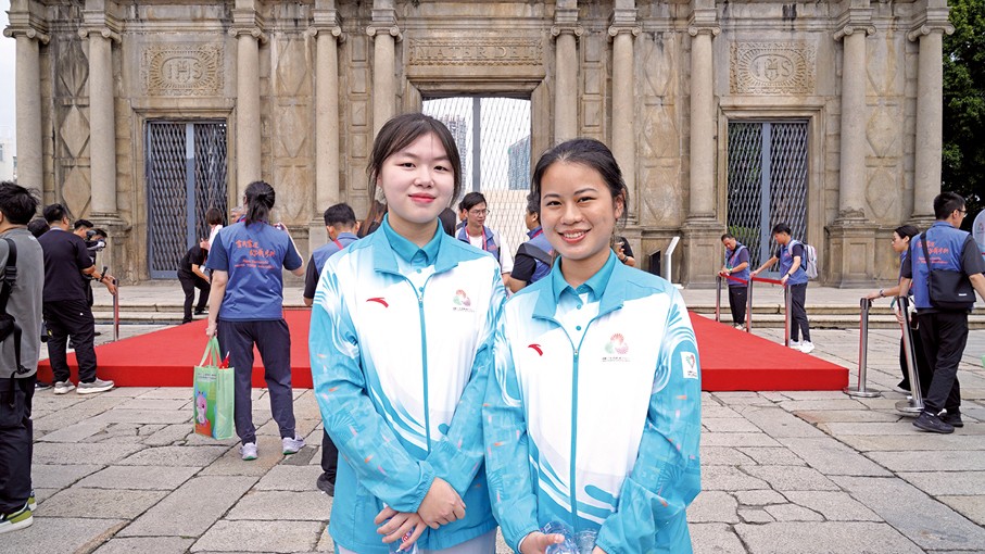 志願者胡同學(左)及林同學:能夠參與此次活動感到自豪,現場氣氛熱烈高漲,沿途市民遊客揮舞國旗及區旗,為火炬手吶喊助威,親身感受到粵港澳三地的團結及凝聚力。