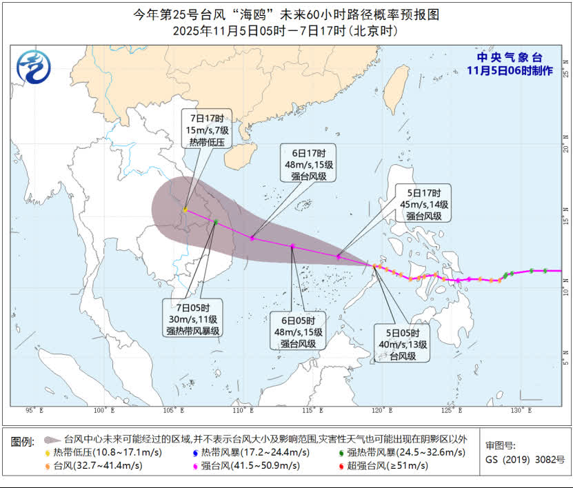 今年第25號颱風「海鷗」已於5日早晨移入南海,強度逐漸加強,最強可達強颱風級(42~48米/秒,14~15級)。受其影響,預計5日至7日,南海大部、東海大部、台灣海峽、台灣以東洋面、巴士海峽及浙江南部沿海、福建沿海、台灣島沿海、廣東沿海、海南島沿海將有6~8級大風、陣風9~10級,其中南海南部將有9~11級大風、陣風12~13級。海南島中東部有大到暴雨,海南島東南部局地有大暴雨。中央氣象台11月5日6時發布颱風黃色預警。