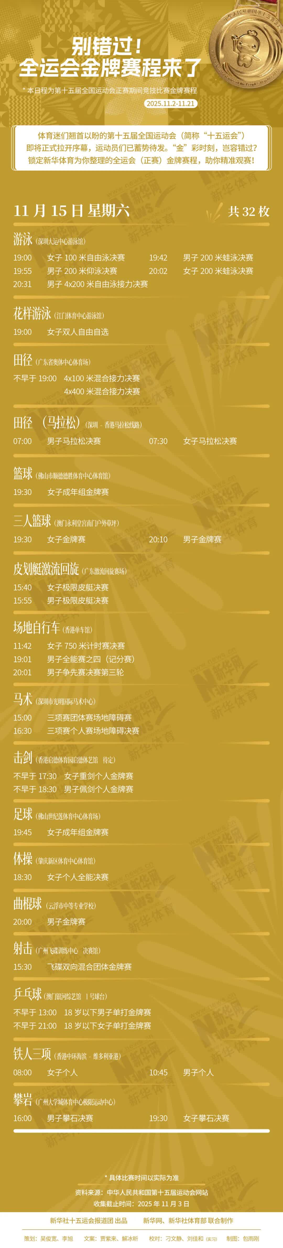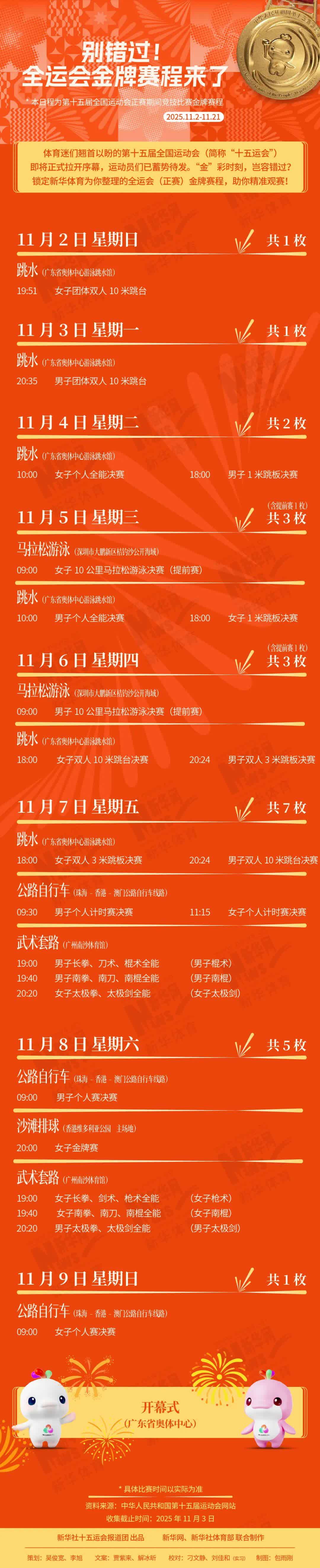 體育迷們翹首以盼的十五運會,即將正式拉開序幕。運動員們已蓄勢待發,「金」彩時刻,不容錯過。這份全運會(正賽)金牌賽程,助你精準觀賽!(來源:新華網)