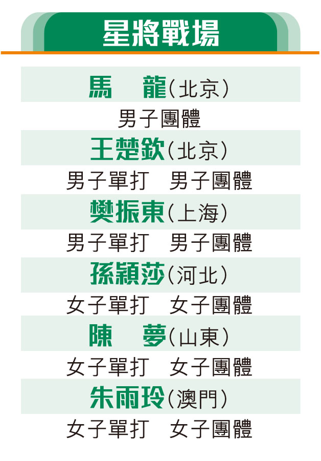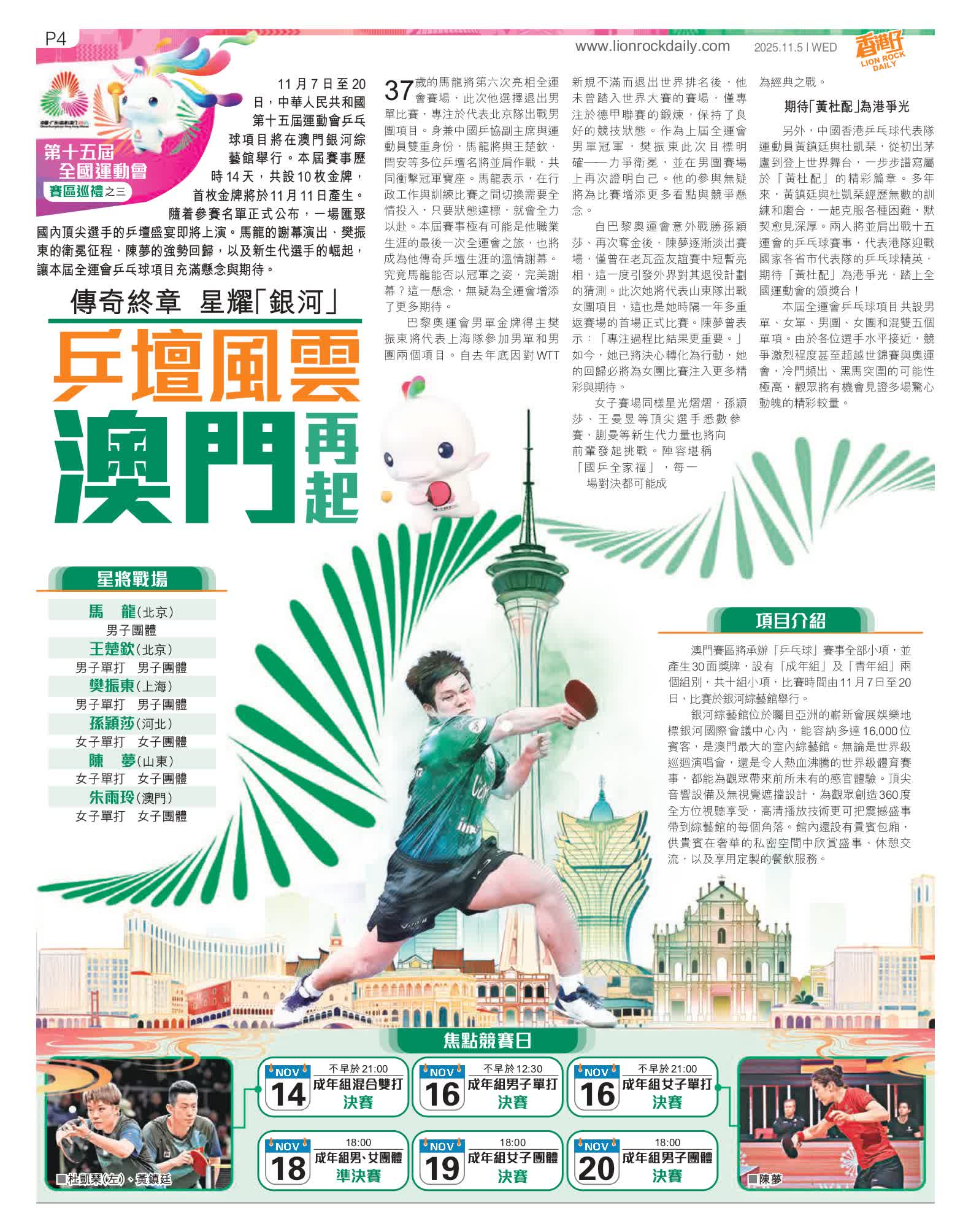 11月7日至20日,中華人民共和國第十五屆運動會乒乓球項目將在澳門銀河綜藝館舉行。本屆賽事歷時14天,共設10枚金牌,首枚金牌將於11月11日產生。隨着參賽名單正式公布,一場匯聚國內頂尖選手的乒壇盛宴即將上演。馬龍的謝幕演出、樊振東的衛冕征程、陳夢的強勢回歸,以及新生代選手的崛起,讓本屆全運會乒乓球項目充滿懸念與期待。