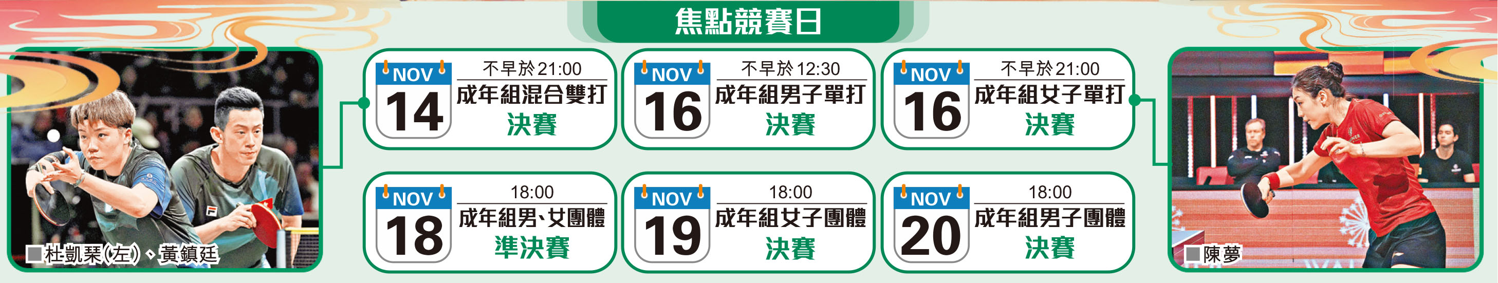 另外,中國香港乒乓球代表隊運動員黃鎮廷與杜凱琹,從初出茅廬到登上世界舞台,一步步譜寫屬於「黃杜配」的精彩篇章。多年來,黃鎮廷與杜凱琹經歷無數的訓練和磨合,一起克服各種困難,默契愈見深厚。兩人將並肩出戰十五運會的乒乓球賽事,代表港隊迎戰國家各省市代表隊的乒乓球精英,期待「黃杜配」為港爭光,踏上全國運動會的頒獎台!