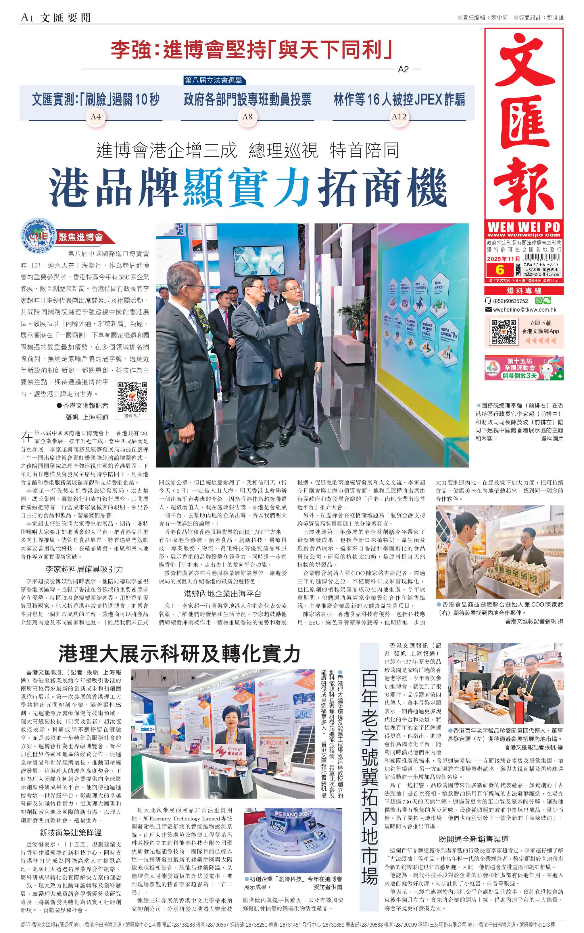 香港文匯報訊(記者 張帆 上海報道)第八屆中國國際進口博覽會昨日起一連六天在上海舉行,作為歷屆進博會的重要參與者,香港特區今年有380家企業參展,數目創歷來新高。香港特區行政長官李家超昨日率領代表團出席開幕式及相關活動,其間陪同國務院總理李強巡視中國館香港展區。該展區以「內聯外通·璀璨新篇」為題,展示香港在「一國兩制」下享有國家機遇和國際機遇的雙重疊加優勢,在多個領域排名國際前列,無論是家喻戶曉的老字號,還是近年新設的初創新銳,都將原創、科技作為主要關注點,期待通過進博的平台,讓香港品牌走向世界。