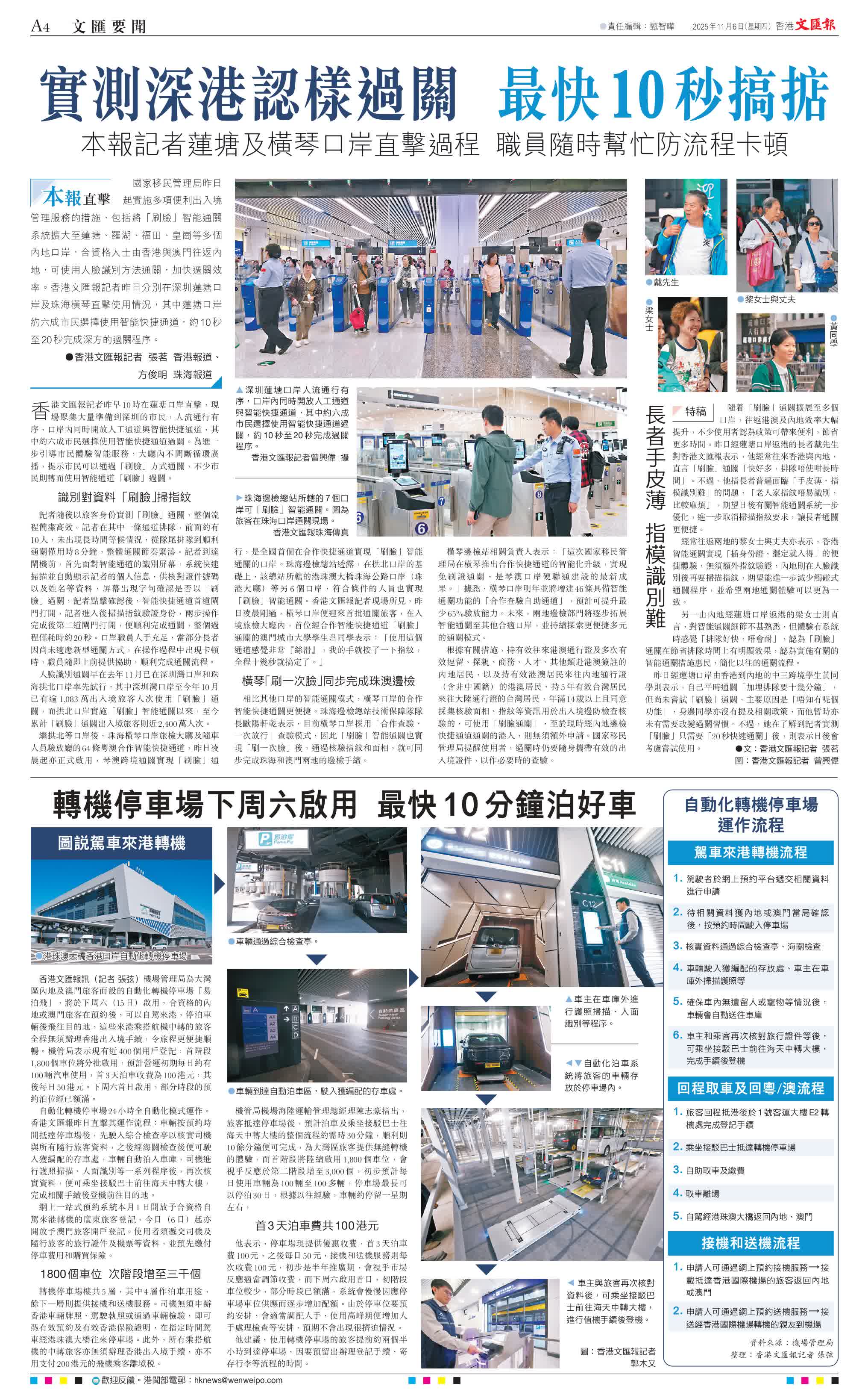 記者隨後以旅客身份實測「刷臉」通關,整個流程簡潔高效。記者在其中一條通道排隊,前面約有10人,未出現長時間等候情況,從隊尾排隊到順利通關僅用時8分鐘,整體通關節奏緊湊。記者到達閘機前,首先面對智能通道的識別屏幕,系統快速掃描並自動顯示記者的個人信息,供核對證件號碼以及姓名等資料,屏幕出現字句確認是否以「刷臉」過關,記者點擊確認後,智能快捷通道首道閘門打開,記者進入後掃描指紋驗證身份,兩步操作完成後第二道閘門打開,便順利完成通關,整個過程僅耗時約20秒。口岸職員人手充足,當部分長者因尚未適應新型通關方式,在操作過程中出現卡頓時,職員隨即上前提供協助,順利完成通關流程。