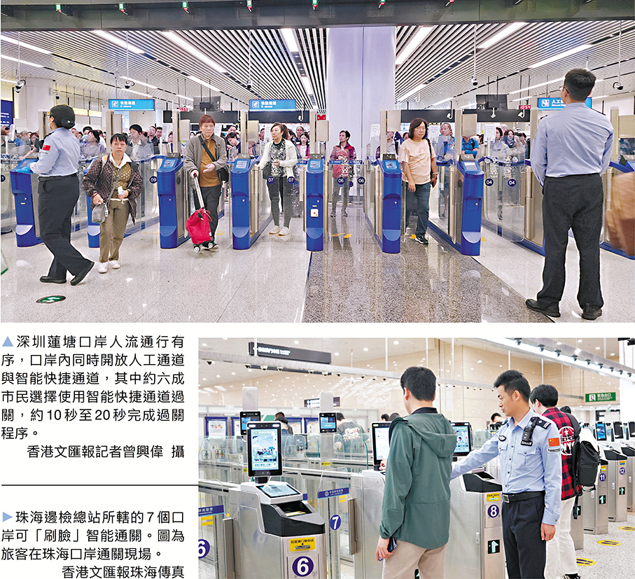 香港文匯報訊(記者 張茗 香港報道、方俊明 珠海報道)國家移民管理局昨日起實施多項便利出入境管理服務的措施,包括將「刷臉」智能通關係統擴大至蓮塘、羅湖、福田、皇崗等多個內地口岸,合資格人士由香港與澳門往返內地,可使用人臉識別方法通關,加快過關效率。香港文匯報記者昨日分別在深圳蓮塘口岸及珠海橫琴直擊使用情況,其中蓮塘口岸約六成市民選擇使用智能快捷通道,約10秒至20秒完成深方的過關程序。
