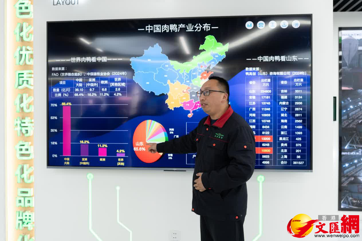 (香港文匯網記者丁春麗、胡臥龍)每年有1億隻肉鴨從這裏出欄,2.6億隻肉鴨在這裏屠宰、分割,與肉鴨相關產業年產值達到200億元……粵港澳大灣區主流媒體走進「中國肉鴨之都」—山東泰安市新泰,感受中國肉鴨產業從「傳統養殖」到「智能集群」的跨越式發展。