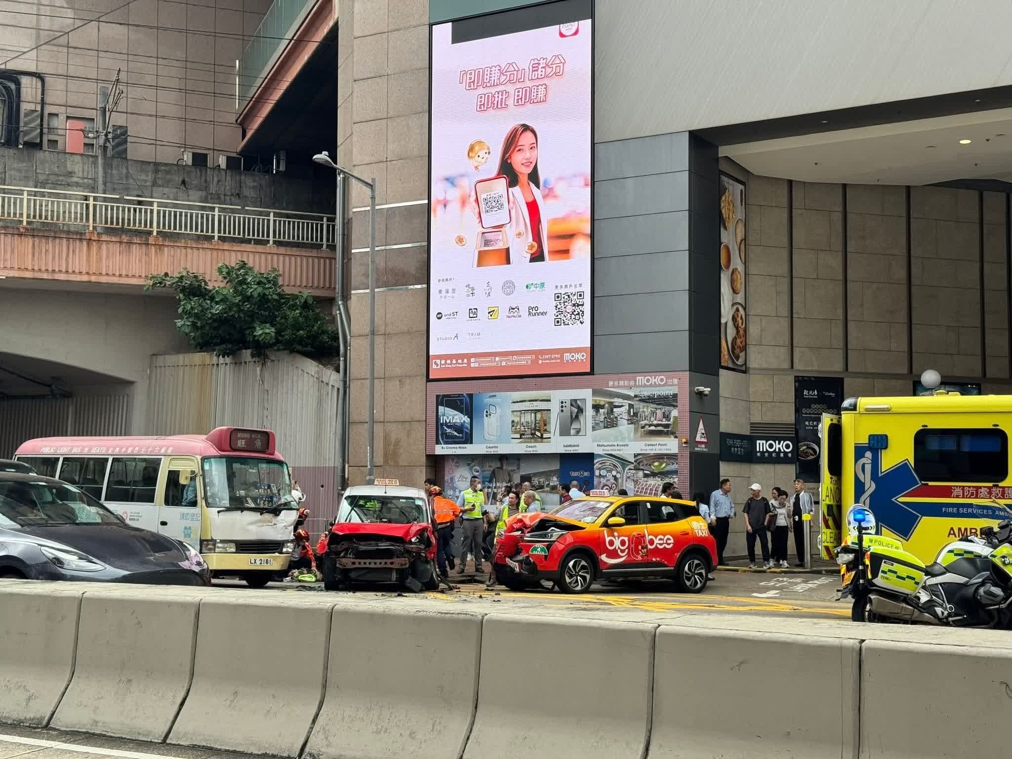 香港文匯報訊(記者 蕭景源)今日(6日)上午近10時半,一輛的士在旺角新世紀廣場車輛出入口處,與另一輛的士和小巴相撞,事故中商場一名保安員被撞倒,與一名的士司機和3名小巴乘客共5人受傷,需由救護車送院治理。