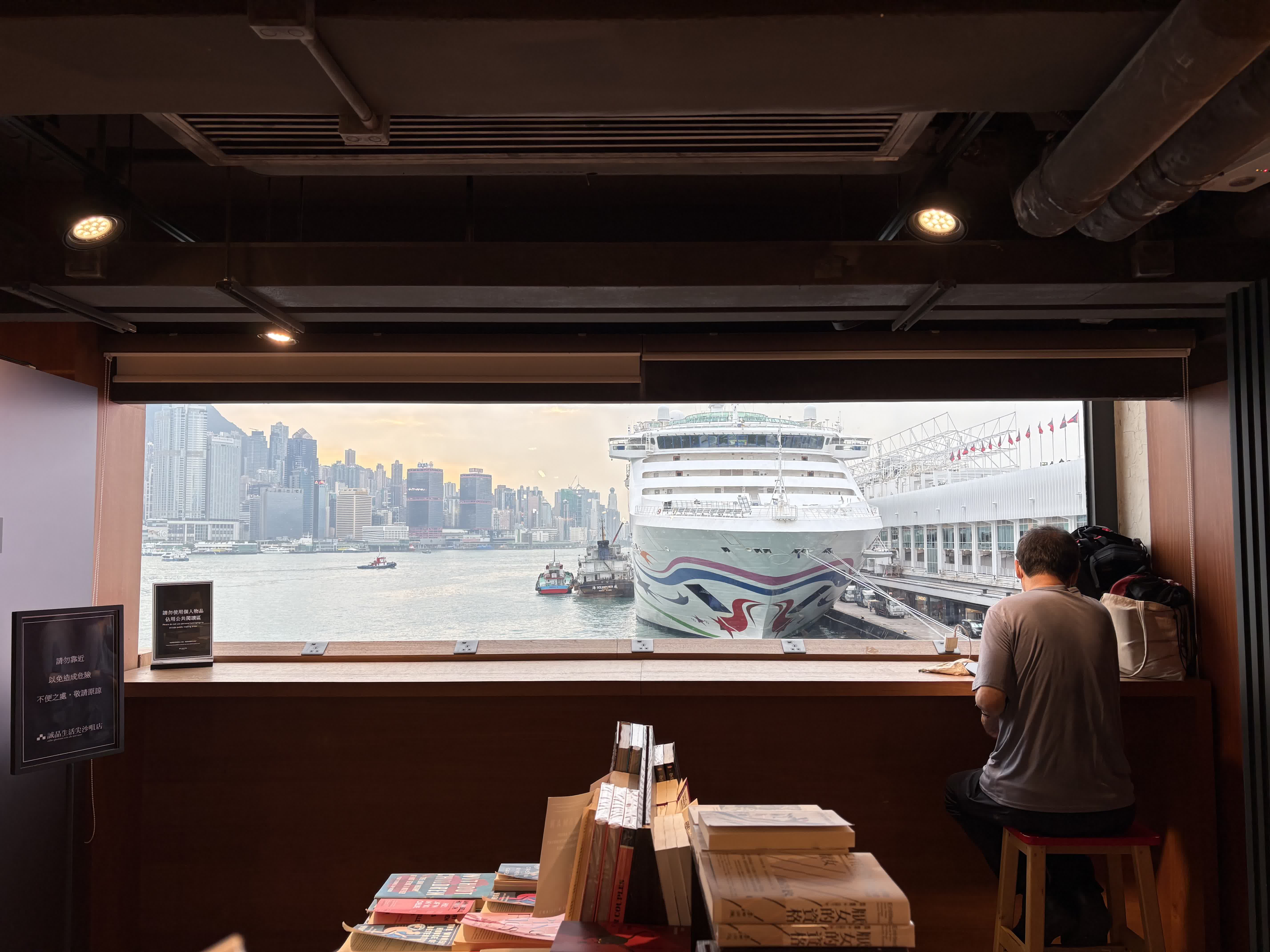 3樓則以「人文藝術」為主題,書籍融合主題選品,將華人獨具一格的人文風景呈現在香港。書架之間貼心設計了閱讀區域,挑選到心儀的書,就近便能坐下,沉浸於書中世界。另外,3樓面向維多利亞港一側,有一扇海景窗戶,窗前的座位是絕佳的免費觀景點。桌上有插座可以充電,在這裏辦公亦非常方便。眼睛疲憊了,抬頭便是湛藍的大海,遠處中環的摩天大樓,道盡香港的繁華與浪漫。