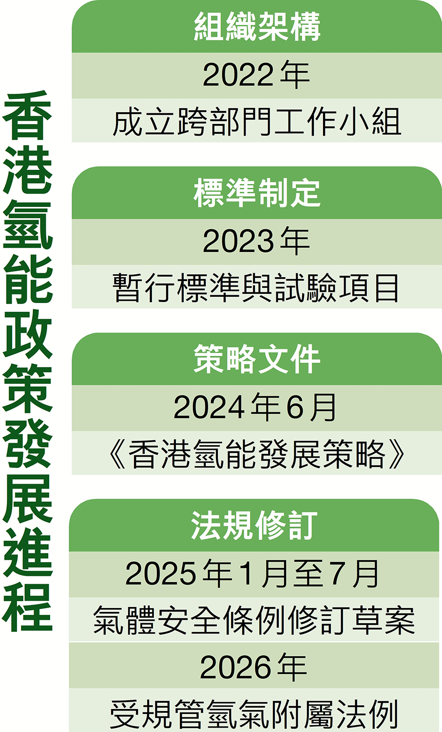 機電署正與國家市場監督管理總局共同探討制定「綠氫及低碳氫認證制度」,預計2027年正式推出。他指,此舉將實現氫氣來源可追溯,並與香港金管局的碳排放標準對接,為綠色金融投資提供基礎。機電署亦獲邀加入國家標準(GB)專家小組,參與國家有關氫能車輛及氫能設備的標準草擬,將香港的運營經驗融入國家標準,對接氫能技術認證、安全監管,建立互認機制,推動氫能的跨境應用。