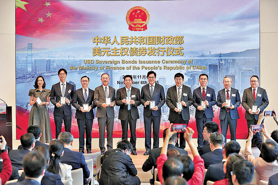 財政部代表中央政府於5日在港成功發行40億美元主權債券。其中,3年期20億美元的發行利率為3.646%,5年期20億美元的發行利率為3.787%。財政部昨日(6日)在香港金管局舉辦發行儀式。據介紹,今次美元主權債券受到市場熱烈歡迎,國際投資者認購踴躍,認購總額為1,182億美元,是發行金額的30倍。其中,5年期認購倍數達33倍。