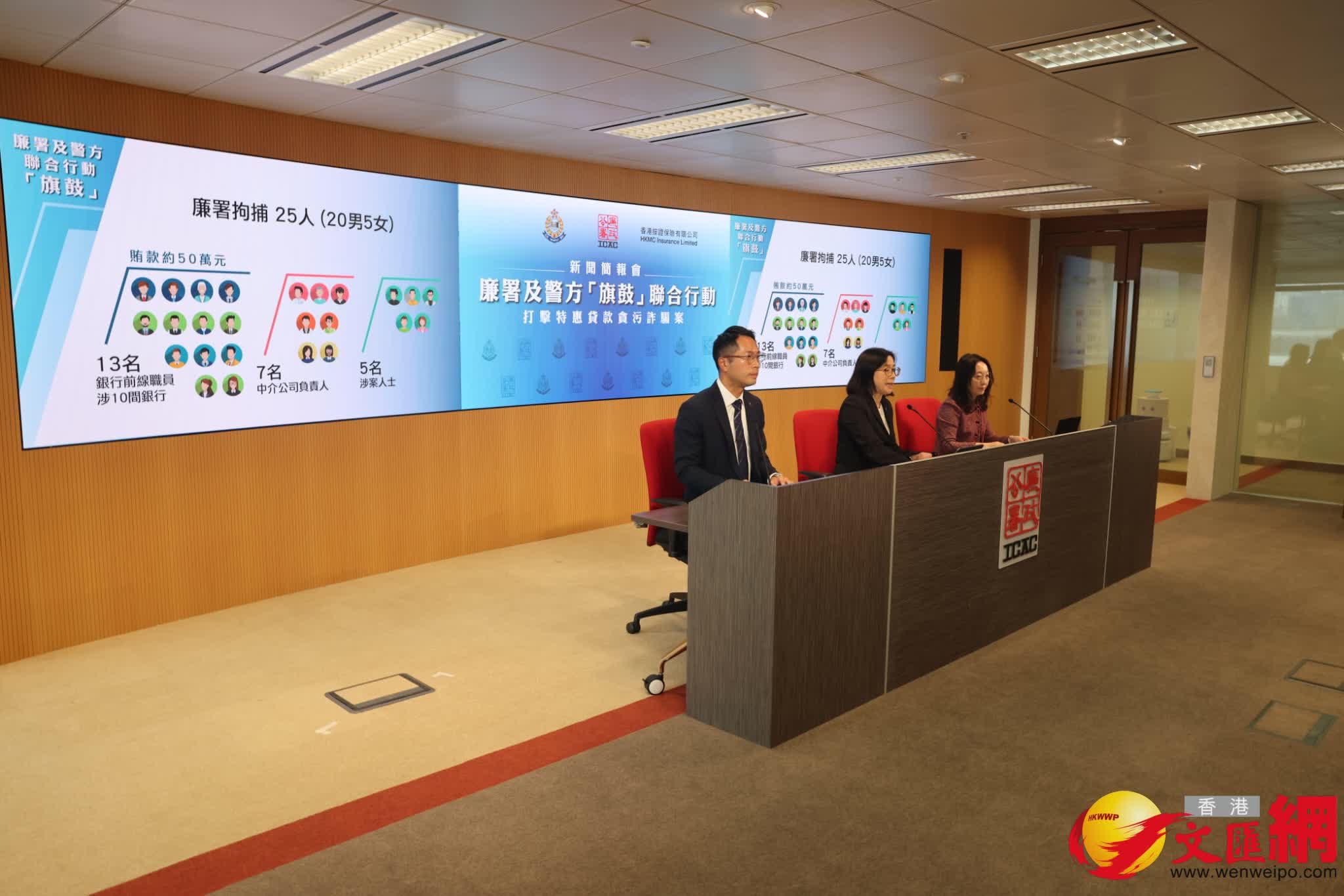 廉政公署執行處首席調查主任余顯麗今日(7日)在聯合記者會上表示,廉署在「旗鼓」聯合行動中,以涉嫌觸犯《防止賄賂條例》中的行賄、受賄罪行拘捕25人,分別20男5女,年齡介乎31歲至63歲,涉及賄款約50萬元。被捕人中,包括13名來自10間本地銀行的前線職員,部分人被捕時已離職;另7名中介公司負責人及5名涉案人士,當中部分中介公司負責人曾經為銀行職員。行動中,廉署人員搜查多處地點,包括涉案中介公司辦公室及被捕人住所,檢獲大批文件、銀行文件及相信用於行賄的逾20萬元現金。
