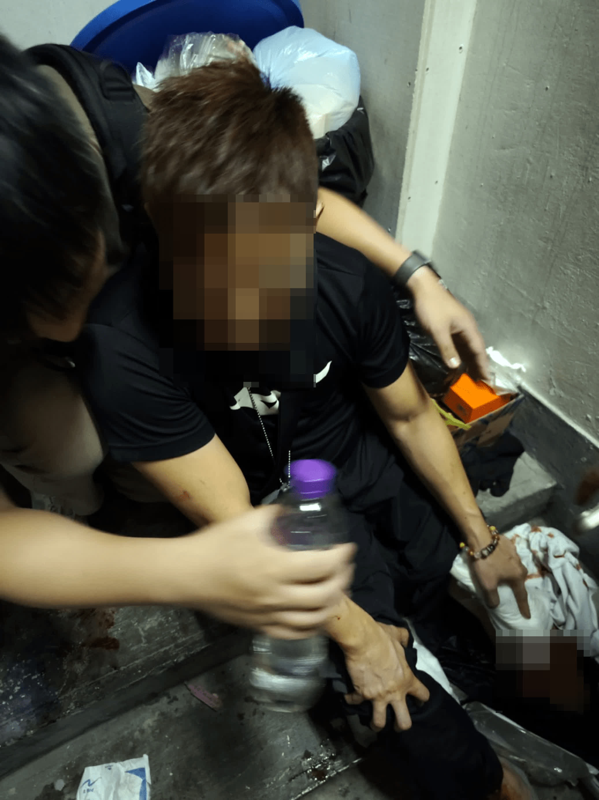警員及救護員到場,證實海關一名29歲督察、一名42歲 高級關員及一名36歲關員,分被斬傷手腳浴血,急送伊利沙伯醫院救治。與此同時,警員破門進入涉案單位,發現疑兇已從廚房窗口攀落天井逃去,並在樓下梯間棄下涉案菜刀。人員隨後又在附近嘉景花園一樓停車場發現屬於疑兇的黑色車輛,檢獲疑犯遺下的鎖匙和銀包。