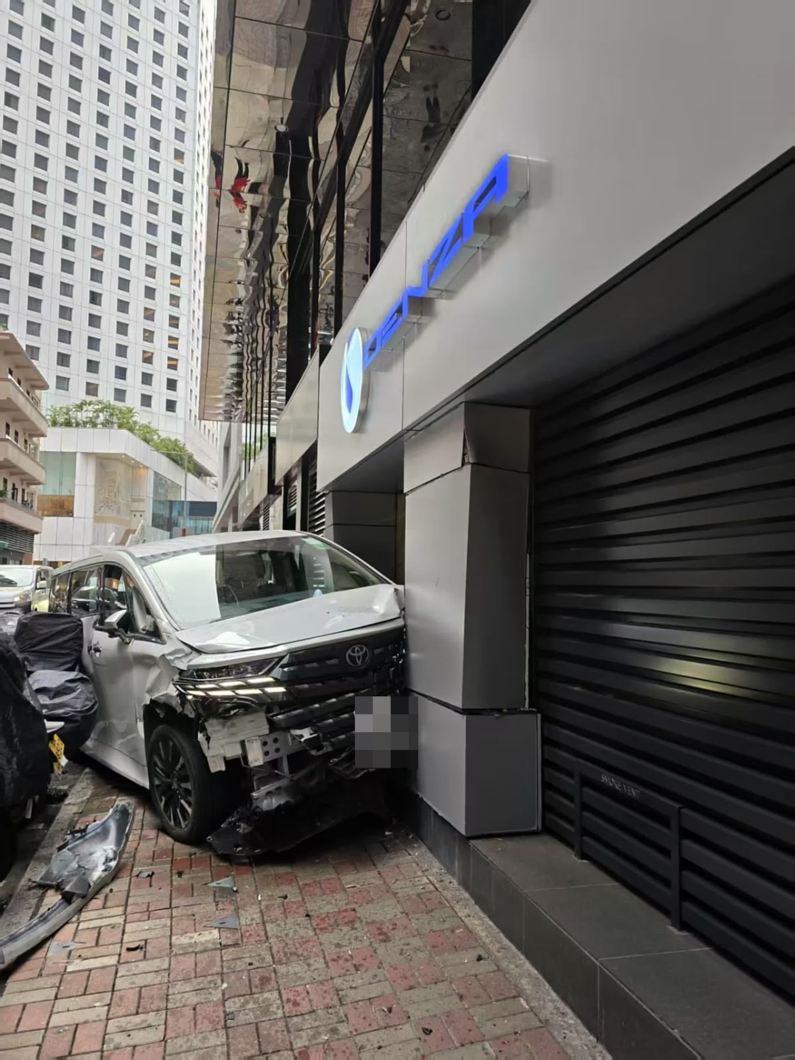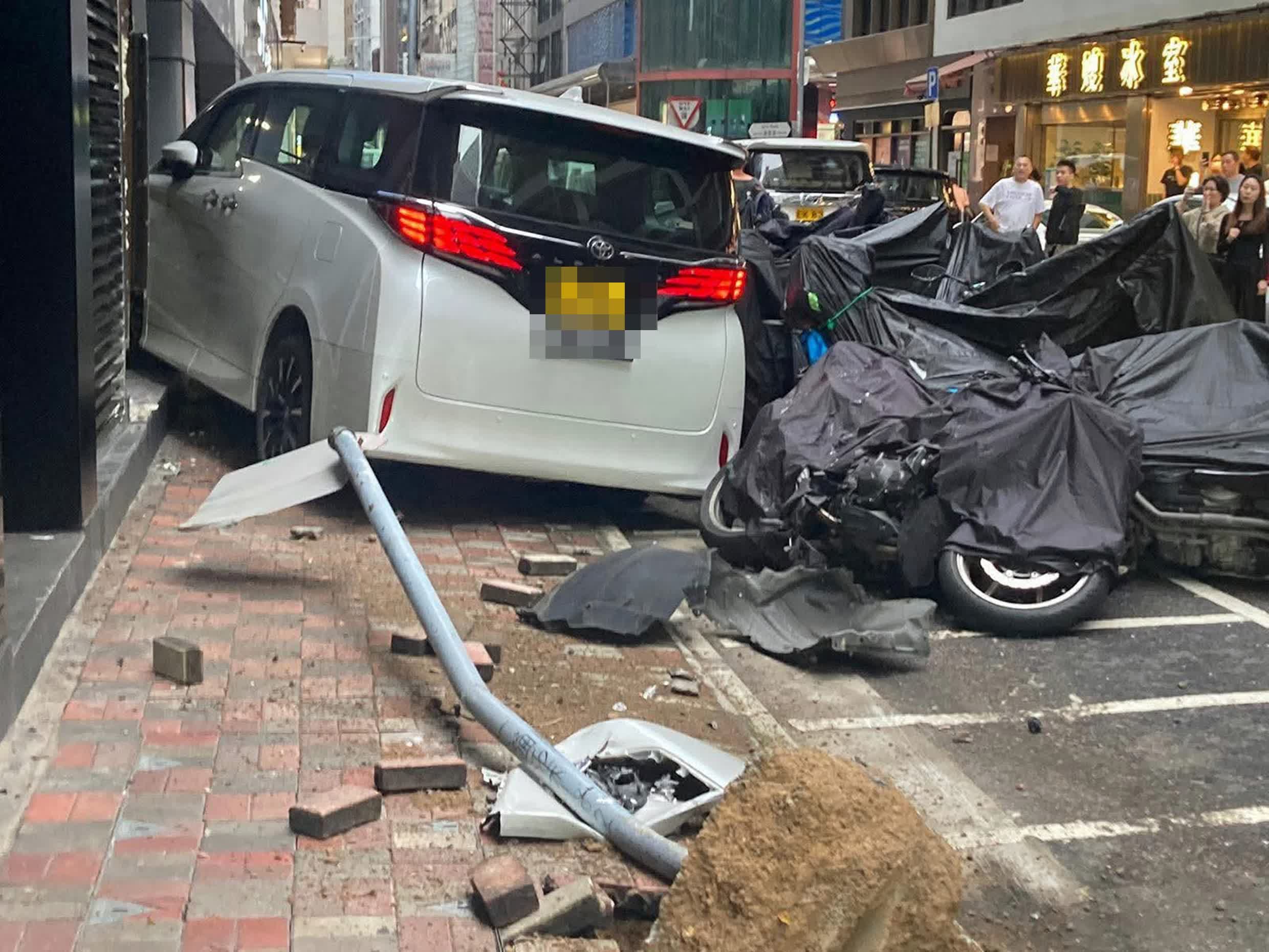 由現場照片可見,涉事持粵港車牌的七人車撞牆後,斜擱在行人路上,泵把飛脫、右邊車頭損毀。現場一個路牌被撞至連根拔起,另外被撞的電單車東倒西歪。警方正調查事故原因。