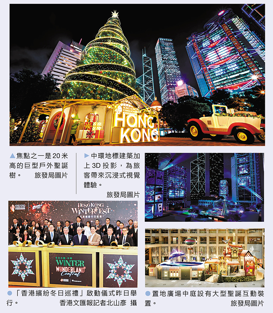 香港旅遊發展局年度盛事「香港繽紛冬日巡禮」將於本月14日至明年1月4日舉行。今年重返中環舉行,並以全新形式舉辦,及首度與置地公司合作呈獻「冬日小鎮·中環」,將中環皇后像廣場花園打造成「聖誕天地」,包括設置相當於6層樓高的20米高戶外聖誕樹,把遮打道打造成浪漫的「星光長廊」,而置地公司亦會於置地廣場中庭呈獻歷年最大型的聖誕互動裝置。旅發局更首次邀請8幢中環地標合作,呈獻「光影匯·中環」,點亮中環,並與業界聯手推出超過300項優惠,涵蓋餐飲、購物、景點及交通。旅發局主席林建岳表示,今年活動是陣容最鼎盛的一年,希望營造濃厚節慶氛圍,推動節日經濟,鞏固香港為亞洲冬日首選旅遊目的地。 ●香港文匯報記者 田至韌