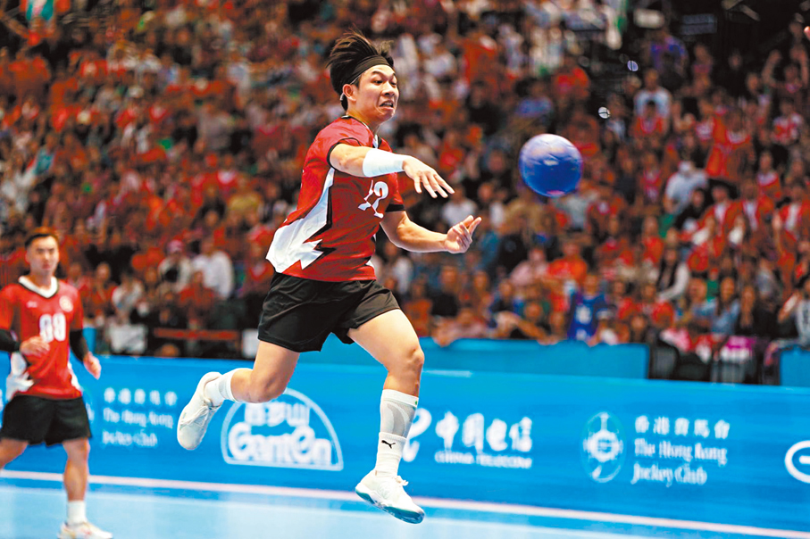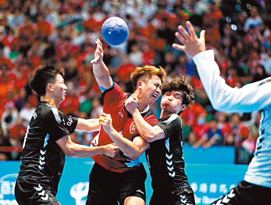 下半場港隊繼續佔據主動,後備門將梁嵐熹救走廣東隊7米球後,連潤滔、郭斯鳴及簡翊暉先後得分,把比分拉開至16:11。廣東隊在暫停後即打出一波3:0攻勢,兩軍之後梅花間竹得分。比賽到最後30秒迎來高潮,港隊與對手僅有一分差距,在球迷落力打氣下,簡翊暉以一記笠射收死廣東隊門將,助港隊以28:26擊敗廣東隊,隊史首次殺入全運四強。完場後一眾港將難掩激動,繞場一周答謝觀眾外,更把裝備拋上看台贈予球迷。