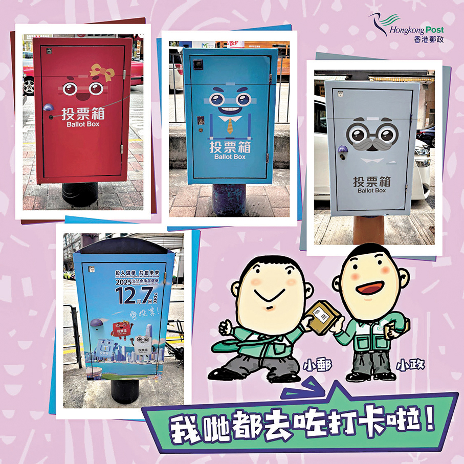 香港文匯報訊 為宣傳2025年立法會換屆選舉,特區政府早前推出「尋找票箱家族AR郵箱」活動,香港郵政昨日在社交平台發帖指,「大家最近有沒有發現街上有些紫色郵筒變成『投票箱』?」原來票箱家族特別版郵箱已經登陸全港各區,並呼籲各位市民踴躍投票。市民除了「打卡」之外,還可以參加「尋找票箱家族AR郵箱活動」,透過完成特別任務,可以獲得票箱家族紀念品。