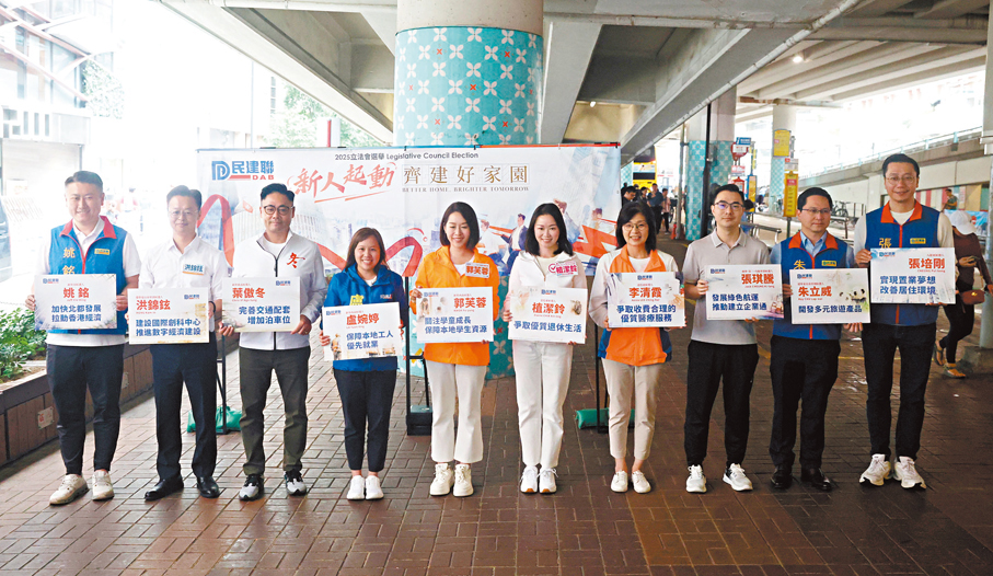 民建聯共派出26人參加第八屆立法會選舉,其中11名現任區議員為完善選舉制度後首次出戰立法會的新人。民建聯昨日在銅鑼灣鵝頸橋橋底舉辦「新人起動 齊建好家園」競選活動,其中10名新人出席,各自闡述其政策主張。他們除了關注香港的經濟、房屋、教育、醫療、北部都會區等整體發展,亦圍繞自己所屬地區提出改善交通、社會福利等民生議題。活動最後,各參選人起跑向前,展示新人的活力拚勁,已蓄勢待發,爭取進入立法會,兌現競選承諾,與市民一起齊建好家園。