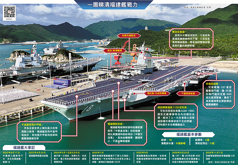 福建艦是中國第一艘電磁彈射型航空母艦,也是中國第三艘航空母艦,舷號為「18」,2022年6月下水命名。福建艦由中國完全自主設計建造,其電磁彈射技術處於世界先進水平。