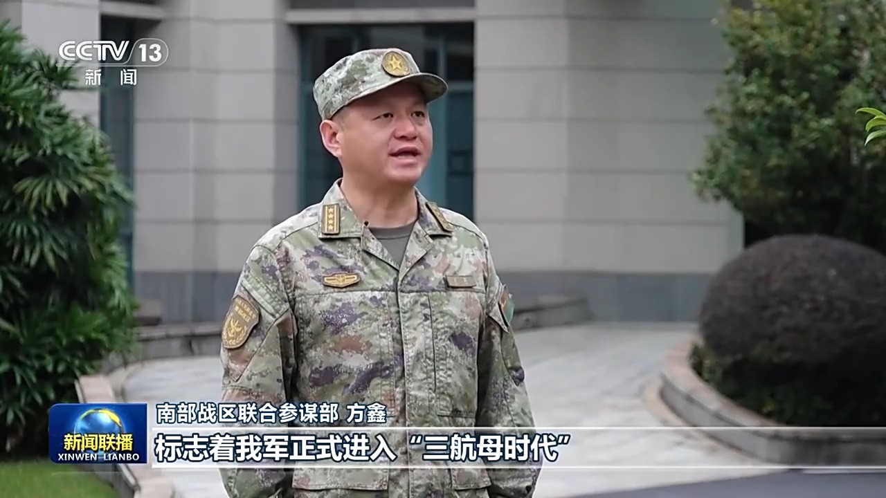 南部戰區聯合參謀部 方鑫:福建艦加入戰鬥序列,標誌着我軍正式進入「三航母時代」,應對複雜局勢挑戰更加從容,官兵勝戰打贏的底氣更足。對我們戰區來說,必須全面提高聯合作戰指揮能力,加快研究探索新型作戰力量運用方法模式,讓「國之重器」真正成為「制勝利器」,推動融入聯合作戰體系,堅定靈活開展軍事鬥爭,堅決捍衛我國領土主權和海洋權益。