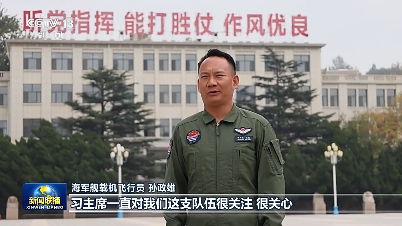 海軍艦載機飛行員 孫政雄:習主席一直對我們這支隊伍很關注、很關心,這次專門到戰位上視察,詳細詢問新型艦載機性能怎麼樣、訓練難點在哪裏,肯定我們的勇氣和成績,勉勵大家科學訓練、刻苦訓練、安全訓練。我們一定牢記囑託,發揚大無畏精神,苦練精飛,駕馭「飛鯊」挺進深藍,搏擊海天。