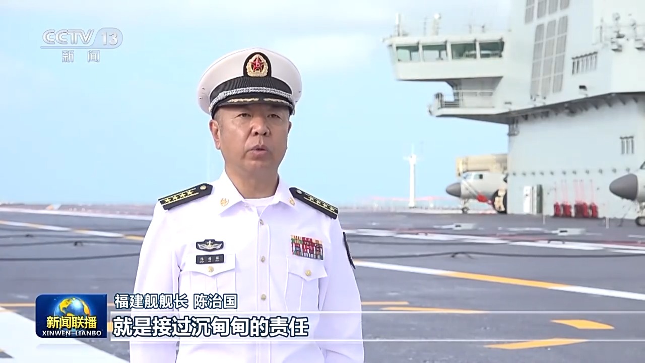 福建艦艦長 陳治國:從習主席手中接過軍旗,就是接過沉甸甸的責任。作為我國第一艘電磁彈射型航母的艦長,有信心帶領全艦官兵駕馭新型戰艦挺進遠海大洋,直面風高浪急。當前首要任務是緊前組織新裝備性能試驗檢驗,加快提升艦載機滿編駐艦保障水平,早日形成編隊體系作戰能力。我堅信,沿着習主席指明的建設發展路徑,福建艦一定能夠劈波斬浪,犁開全新航跡,堅決完成黨和人民賦予的使命任務。