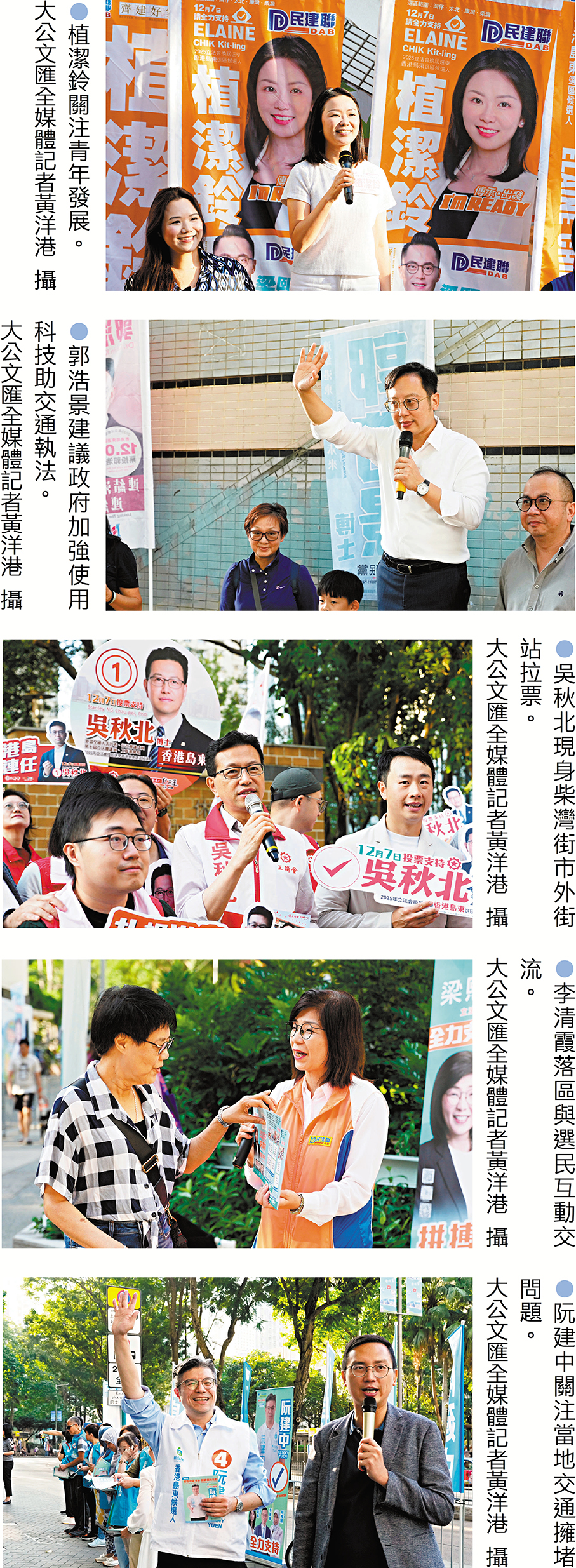 香港文匯報訊(大公文匯全媒體記者 劉妍伶)港島東選區出現「5爭2」的激烈角逐,5名參選人吳秋北、李清霞、郭浩景、植潔鈴及阮建中,昨日在太古康山道擺街站造勢,他們各自聯同義工團隊,向市民展示自己的政綱理念,與街坊交流、闡釋政綱,力爭選民支持。