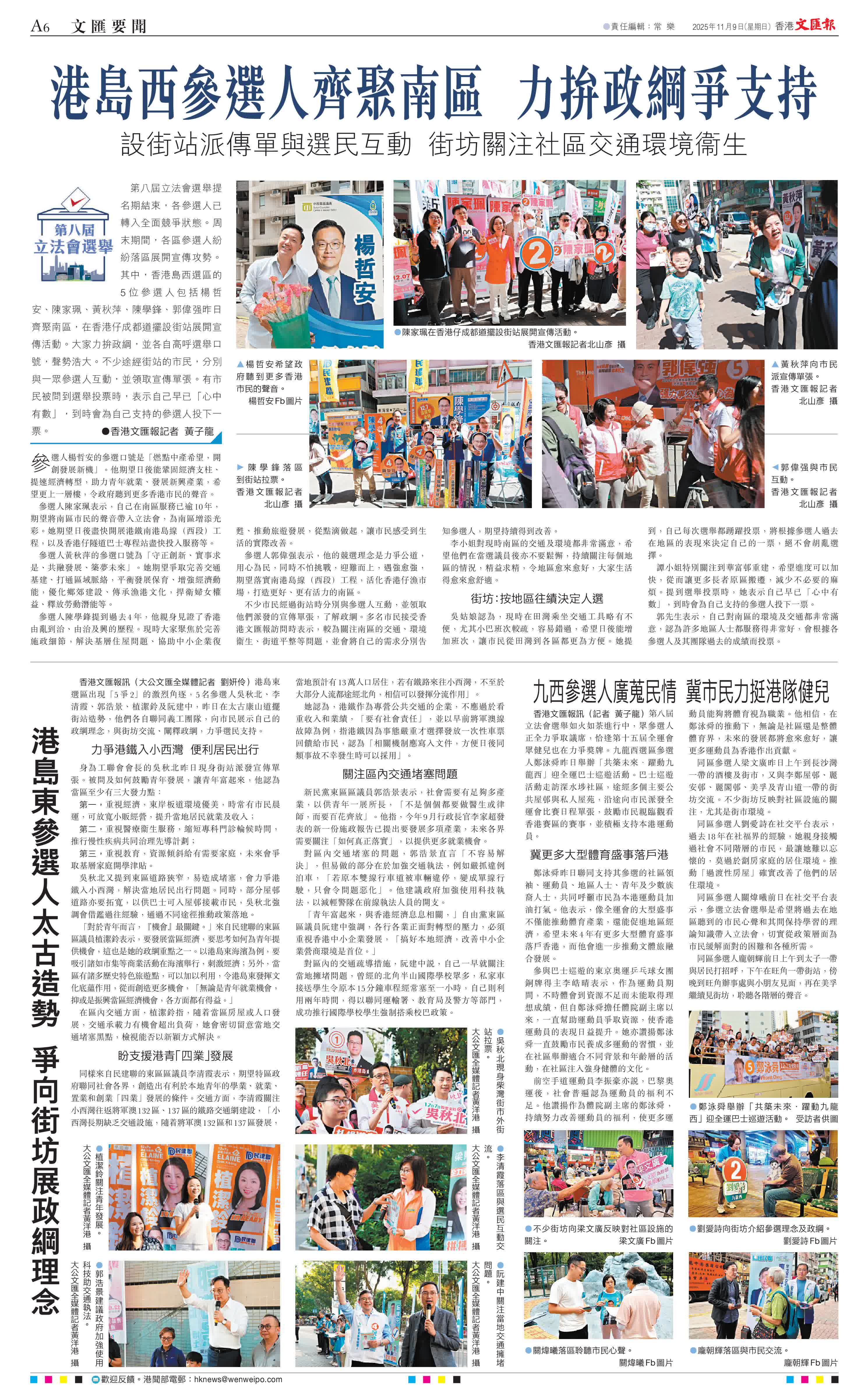 不少市民經過街站時分別與參選人互動,並領取他們派發的宣傳單張,了解政綱。多名市民接受香港文匯報訪問時表示,較為關注南區的交通、環境衞生、街道平整等問題,並會將自己的需求分別告知參選人,期望持續得到改善。