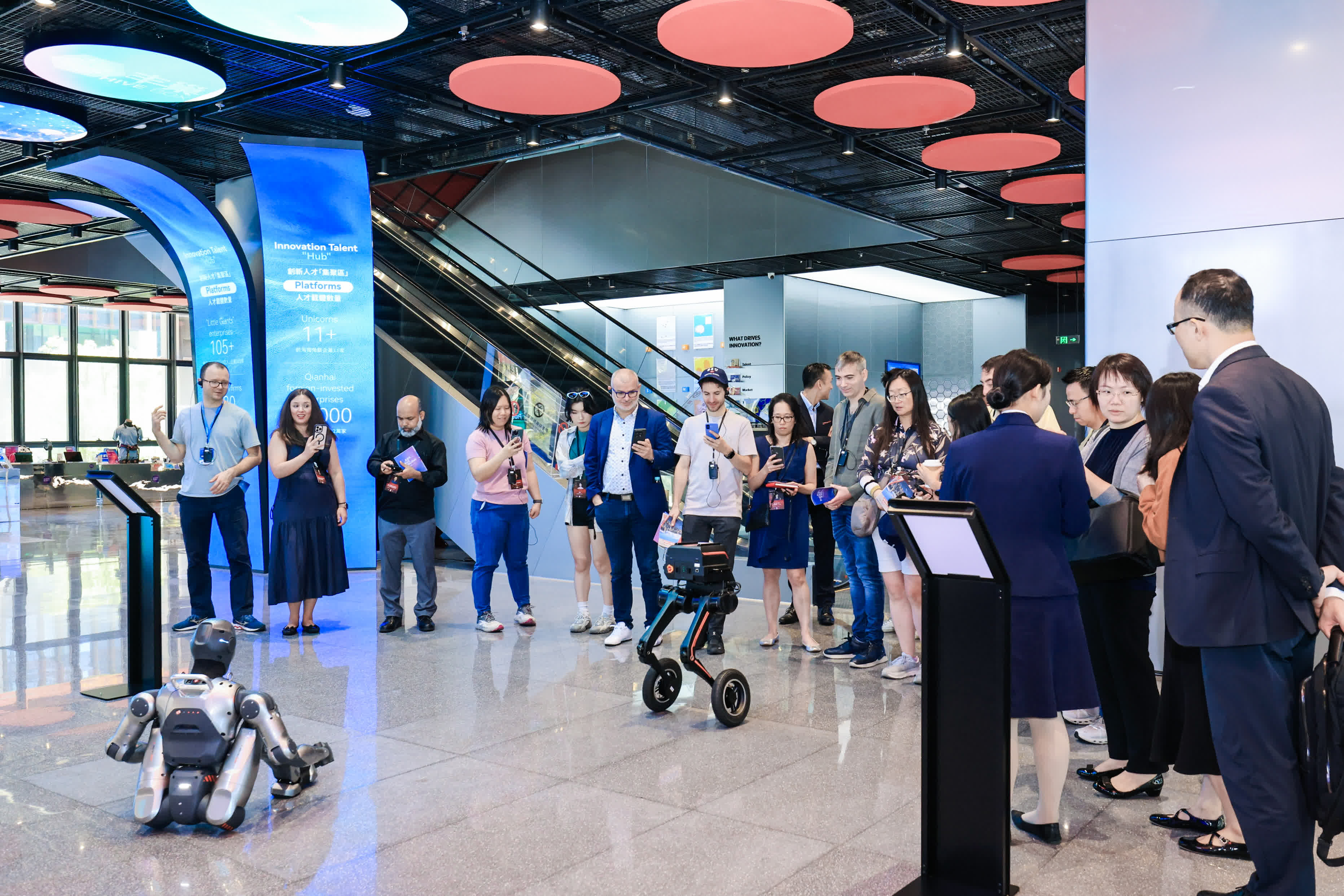 參訪團首站來到「前海五號樓」,在這裏,人形機器人、雙足機器人、AR眼鏡、3D打印等前沿科技產品,創新應用讓人眼前一亮,全方位展示了前海在技術攻關、創新創業方面的最新成果。在隨後的政策推介會上,香港人才服務辦公室陳海勁總監、前海管理局相關負責同志分別介紹深港兩地生物醫藥產業發展、人才集聚的專項政策。現場互動熱烈,參訪團圍繞技術轉化、營商環境、就業機遇等話題紛紛踴躍提問。其中,香港的人才入境計劃、與國際接軌的發展環境引發強烈關注,而前海蓬勃的市場活力、有競爭力的研發政策,更是為兩地注入了強勁動能。